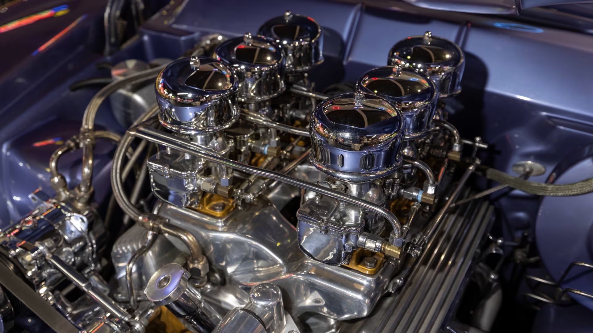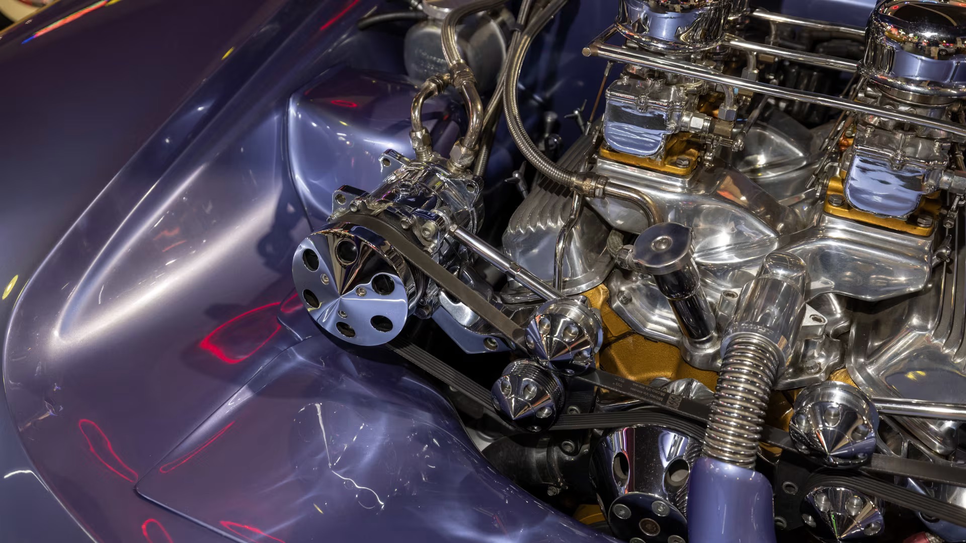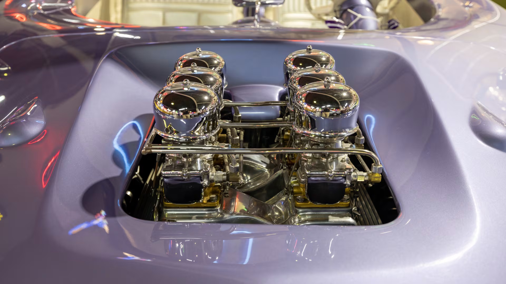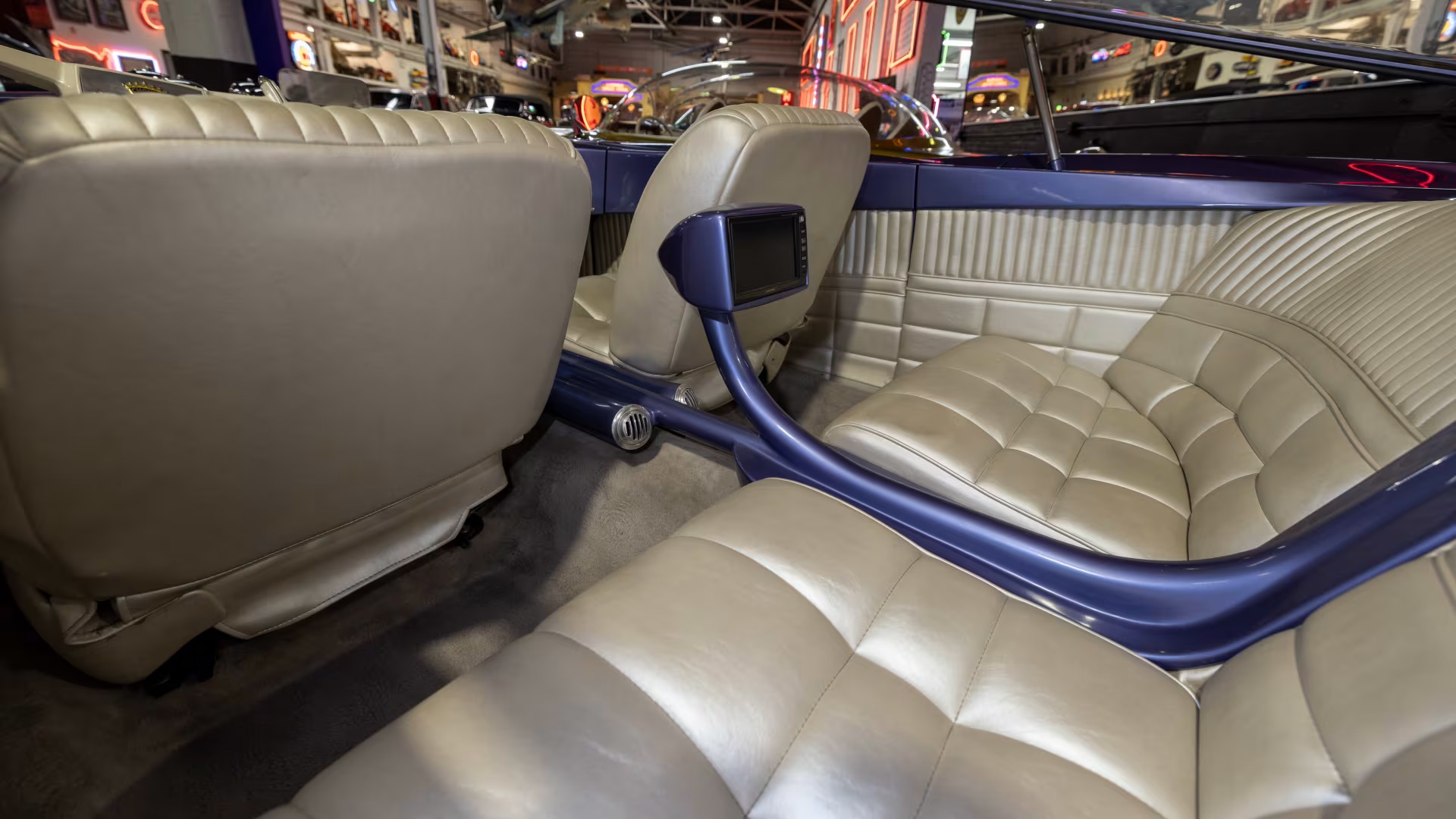 Underneath its exquisite body, the Beatnik incorporates modern engineering for reliability and drivability. The custom body sits on a modified chassis from a 1988 Lincoln Town Car, providing a solid foundation for the ambitious project. Power is supplied by a high-performance Chevrolet 350 cubic-inch V8 engine, topped with six carburetors. The powerplant is dressed with period-appropriate chrome and polished components, including finned Moon valve covers and stainless-steel braided hoses. An automatic transmission, Vintage Air climate control, and an updated audio system also bring modern convenience to this vintage-inspired machine.