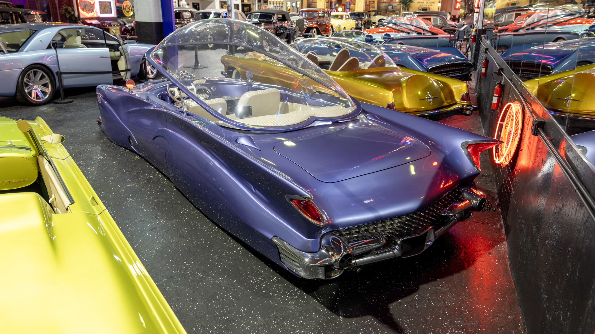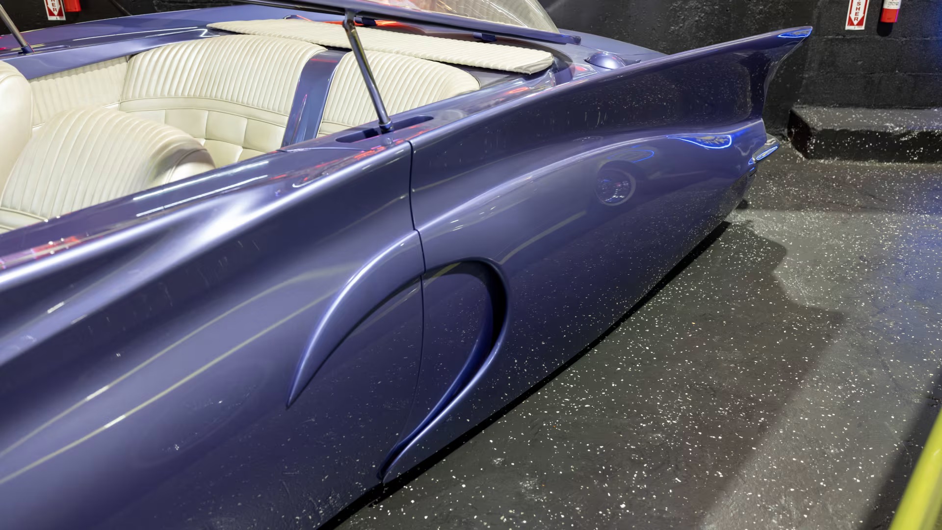 While the project started with a 1955 Ford, very little of the original vehicle remains, aside from a few key components. Fioto’s vision involved extensive modifications and the seamless integration of parts from several different classic American marques. The exterior features a distinct lavender paint job with hand-formed steel and aluminum bodywork, meticulously welded to create a cohesive, flowing design. The front is dominated by a customized bumper from a 1959 Cadillac, while the rear features a bumper from a 1958 Cadillac. The fins and taillights are sourced from a 1960 Chrysler, and the canted quad headlights nod to late-1950s Lincolns. The result is a spectacular blending of iconic automotive styling cues into a singularly unique and radical aesthetic.