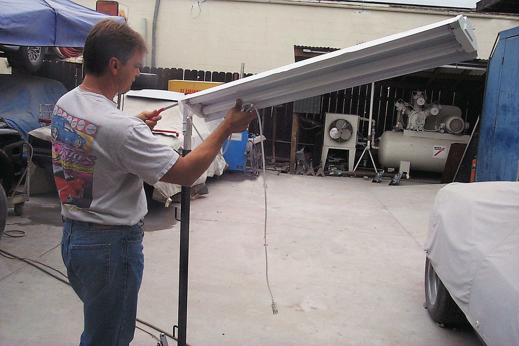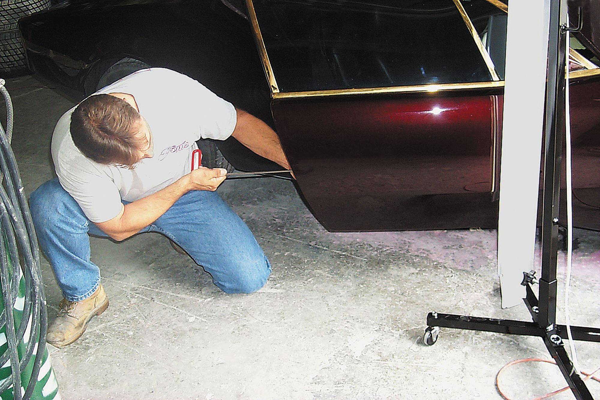 Tom sets up the adjustable lamp that helps find the dents.Work the lamp back and forth until you have it properly focused on the dent you want to fix.