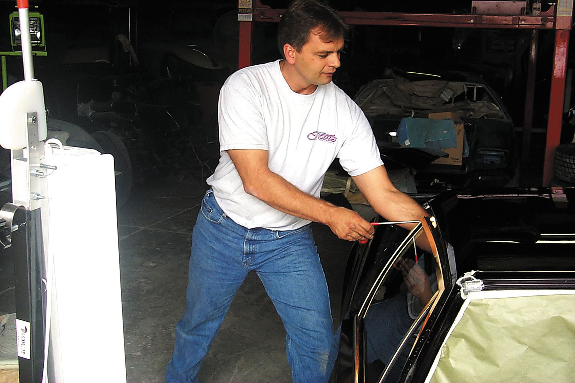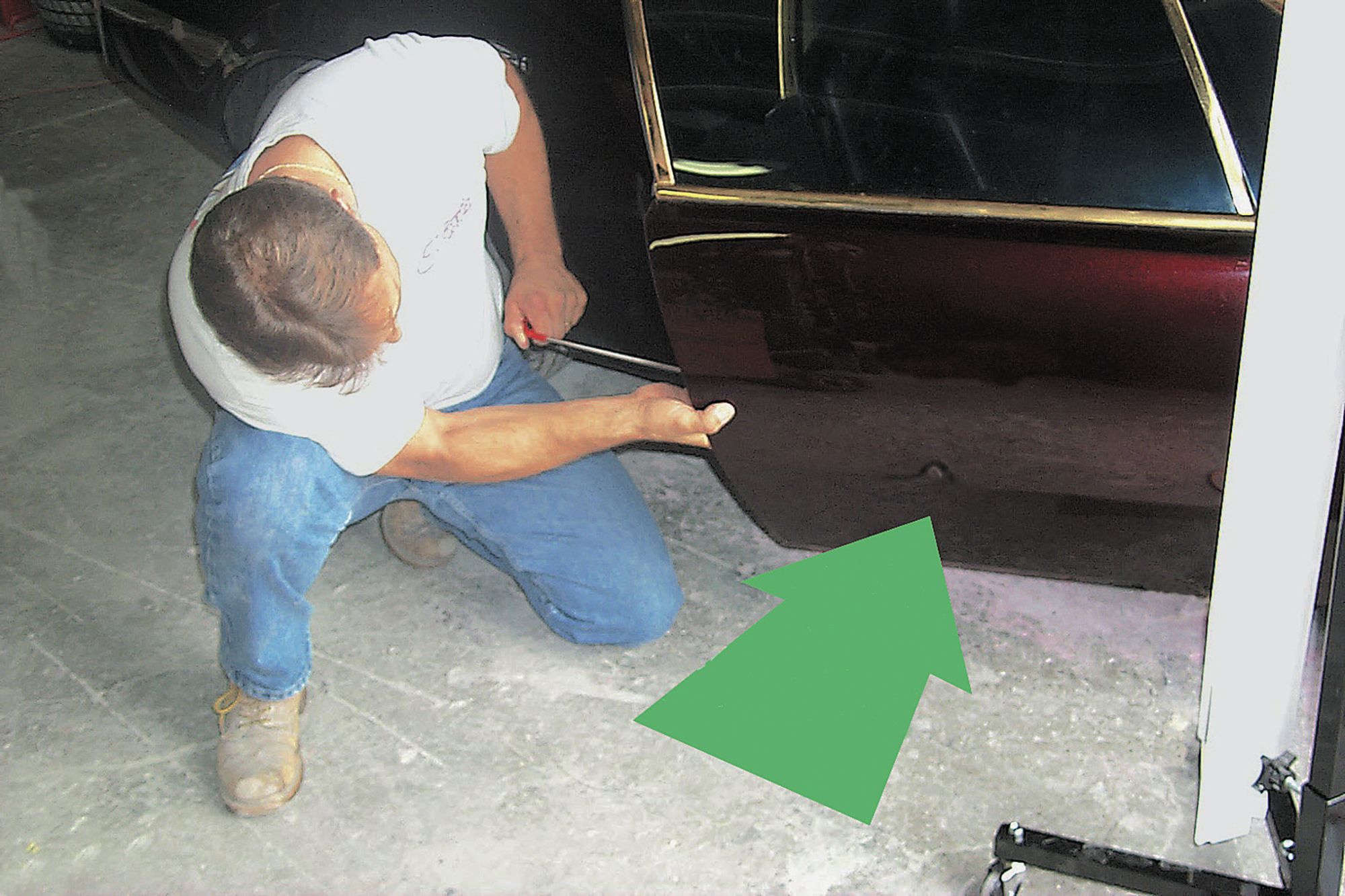 The instructions so far have been for working on hoods, decklids and tops, but doors are different. Often as not, to repair a door you need to go down past the lower edge of the raised glass window. Never try to work on a door with the window down because you will likely break the glass if you do.