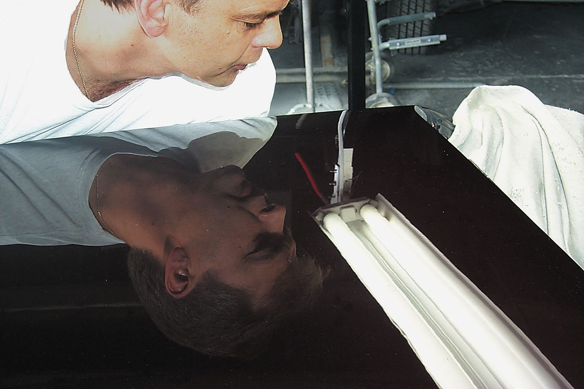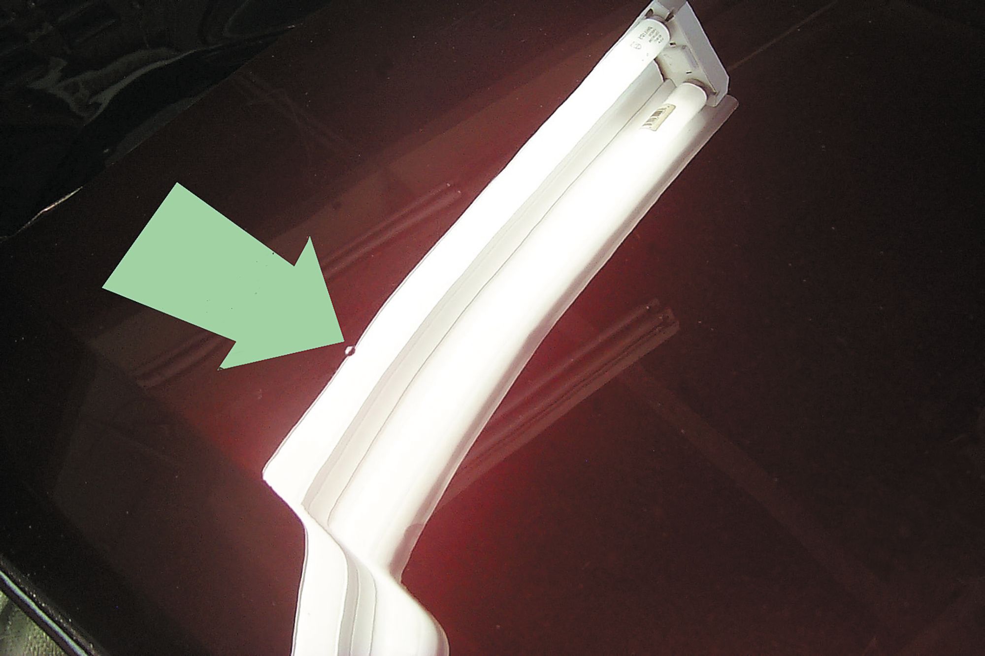 When using the light, you will notice that the top edge of the reflection is fuzzy, and the bottom edge is sharp. Many technicians start by working a dent along the upper, softer edge of the reflection and then finish by moving the light so that the last bit of the dent is in the sharp edge at the bottom. The yellow center between the bulbs can often be used to find ripples and unevenness in a panel.