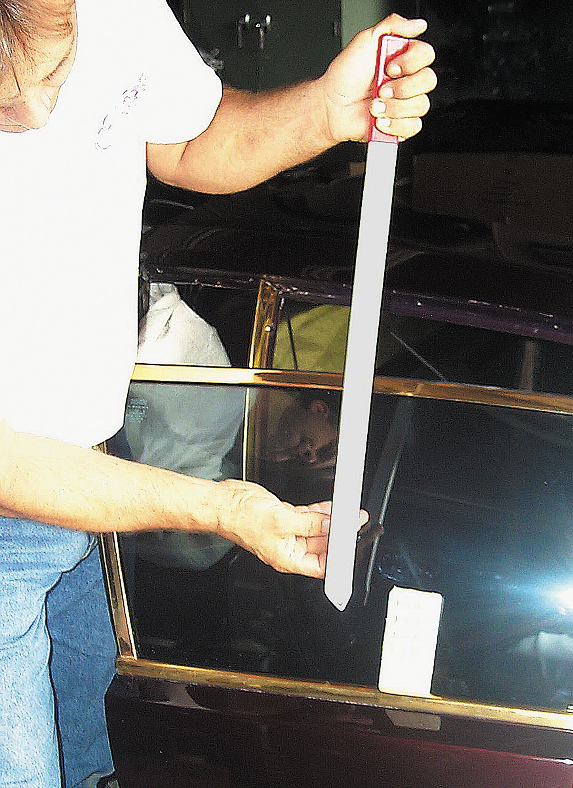 Begin door repairs by tapping in a Teflon wedge to press the glass against the inner window frame. When it is displaced, slide the long, flat tool that looks like an English broadsword into the slot. Position your light so you can see your dent, then begin massaging it out with the tip of the tool. You can also reach dents through the latch pocket in the door, and if there is no other way, you can resort to drilling a hole in the end of the door for access; a plastic plug can be inserted in the hole afterwards.