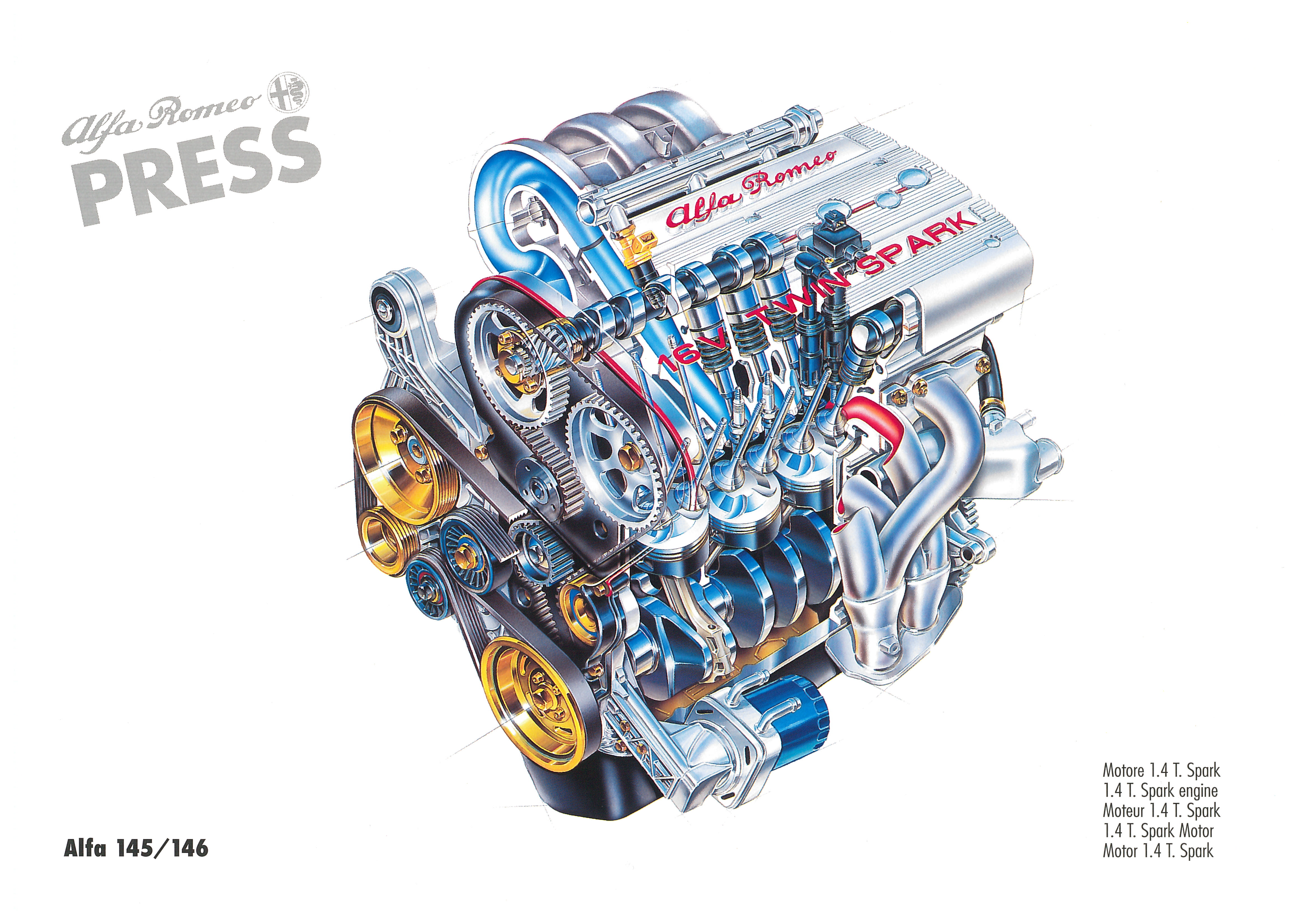 As the name implies, the alloy head of the Twin Spark incorporates two spark plugs per cylinder. Getting dual plugs to fit in a combustion chamber that already held four valves was no small feat; the engineers put one in the center, for maximum efficiency, and a second, smaller-diameter plug on the edge of the chamber between an inlet and an exhaust valve. Though impact on overall performance wasn’t significant, the second valve let the engine idle more smoothly in lean conditions.