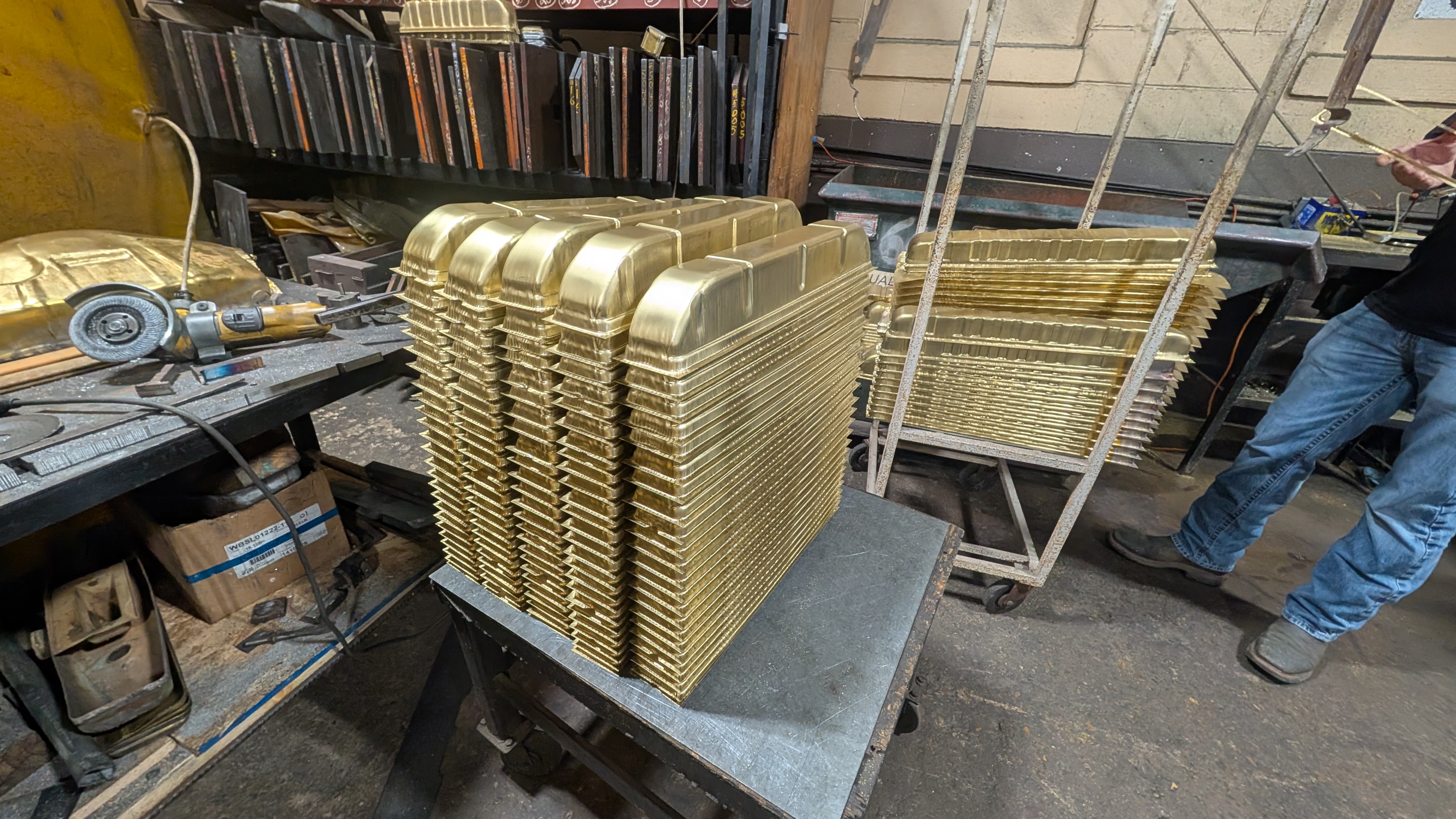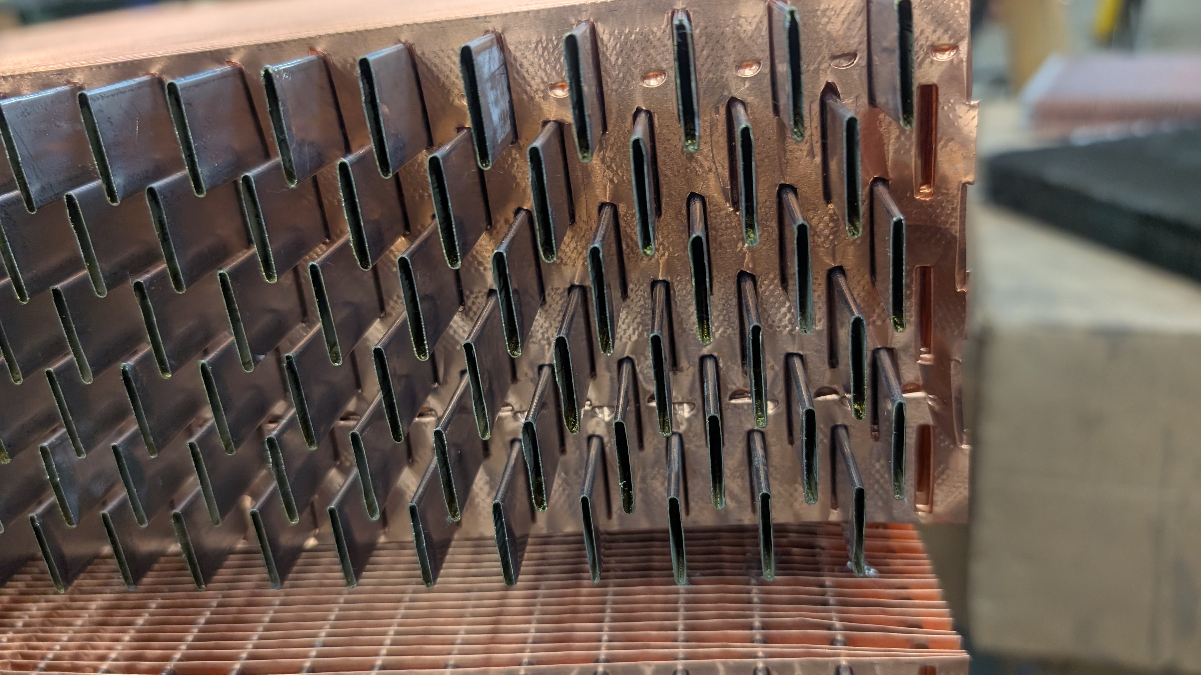 This is a stack of newly formed Copper-Brass radiator tanks waiting to be mounted to cores at the U.S. Radiator facility in Gadsen, AL. Copper-Brass is more effective at heat transfer, but can’t have as many rows of tubes as aluminum.This U.S. Radiator CB core uses flat-fin technology which allows more contact with the wall of the tube and allows more tubes in the same space. When it comes to radiators, more is usually better.