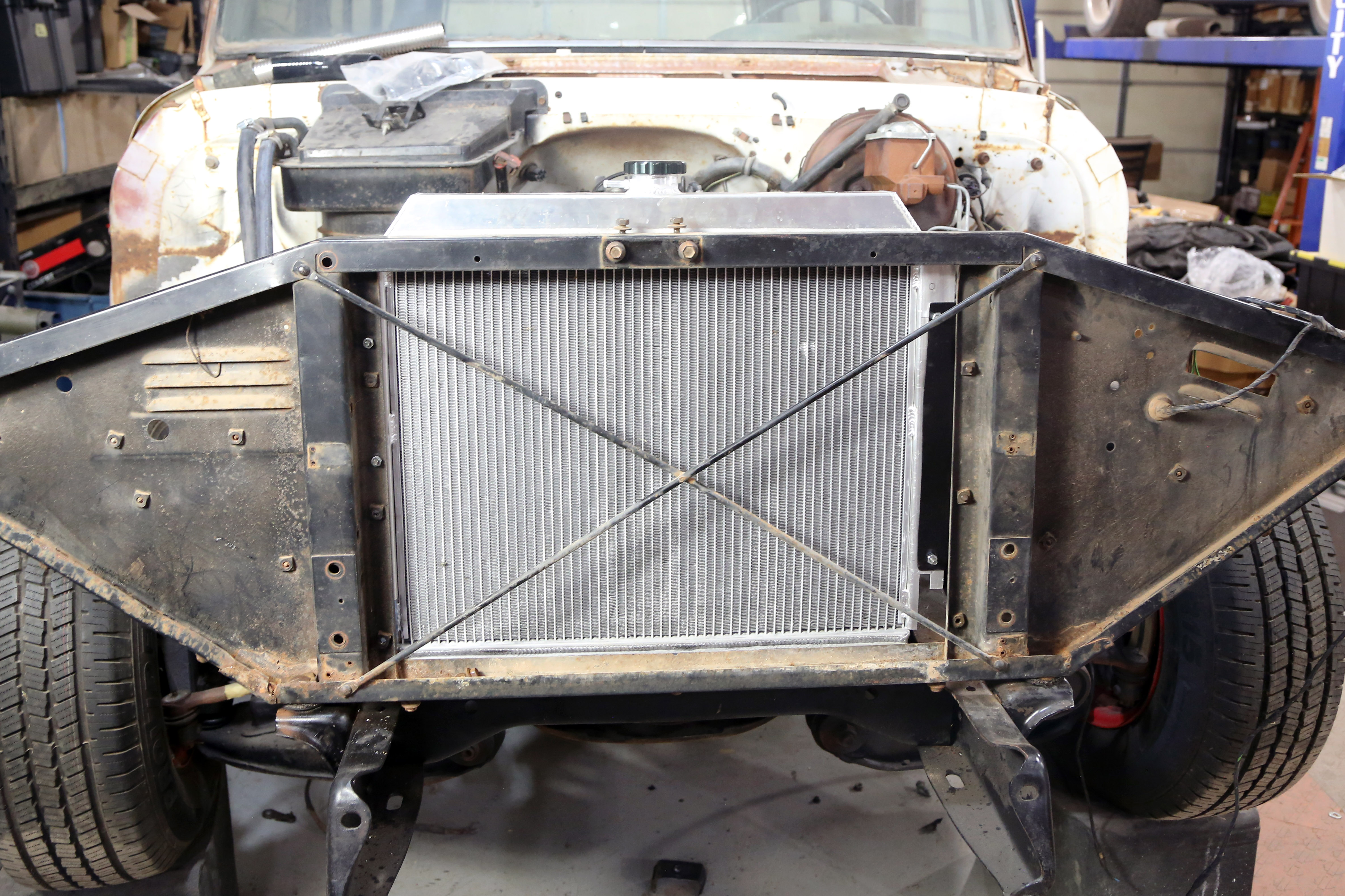 Downflow radiators may limit your options because the core support is only large enough to fit a downflow radiator, there is no room for side tanks. This 1966 GMC Suburban keeps its 5.3 LS engine cool with a downflow aluminum radiator that fills the opening with core. There isn’t room for anything bigger.