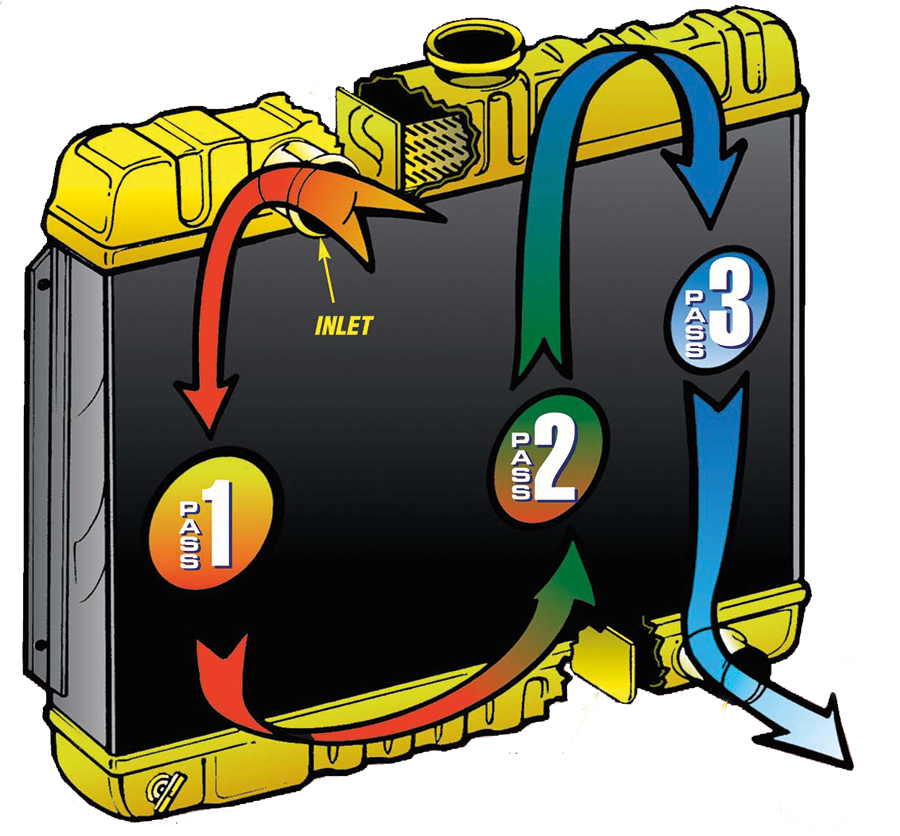 In many cases, you can order a new radiator that looks like a typical radiator but is divided internally into two or three sections. A typical radiator flows all the coolant through the entire core in one pass. A dual or triple flow core splits the core so that the coolant flows through each section of the core, giving the coolant more time to transfer heat, making it far more efficient. The U.S. Radiator Tripleflow option can drop engine temps up to 20%, which is a huge gain. If you have a hot-running engine, this could be the difference you need.