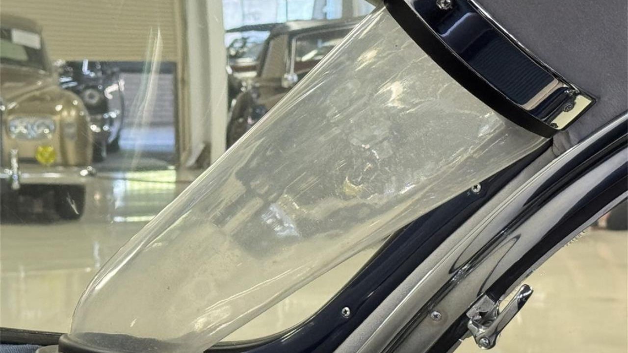 The Rangoon Red body is accented with chrome bumpers and bright trim and badging. Exterior features include dual side mirrors, center-mounted rear gas cap, and single exhaust outlet. A beige manual convertible top with a plastic rear window covers the passenger compartment. In better weather, it can be folded and stored under a beige vinyl top boot.