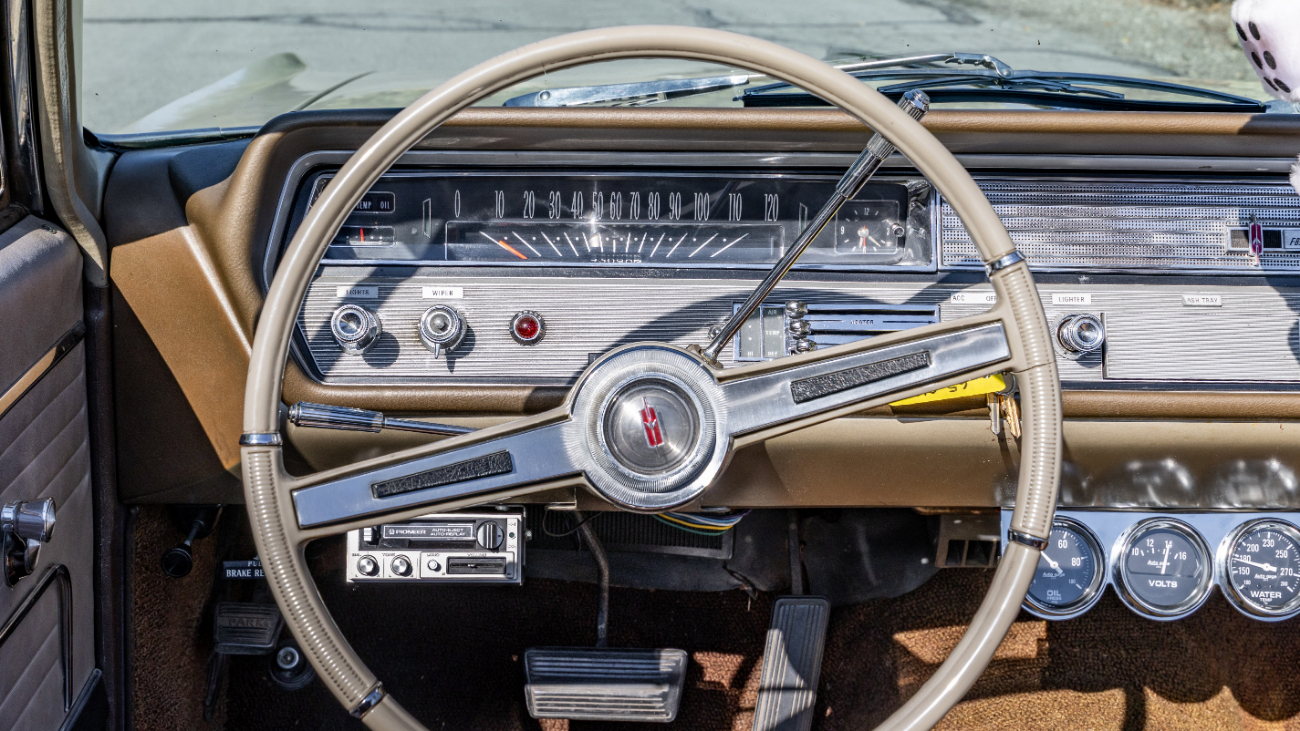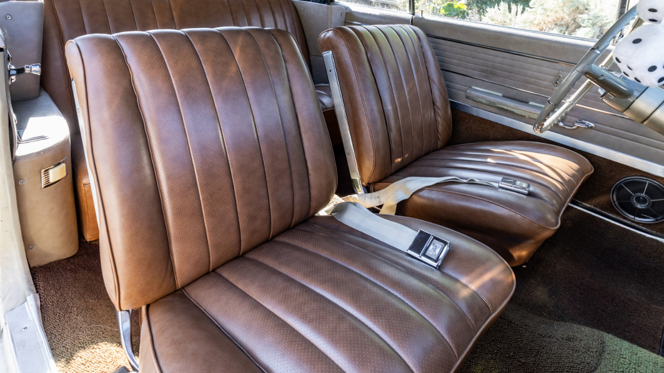 The seats have been reupholstered in brown vinyl, which replaces the original Fawn. There’s no optional console between the bucket seats, so the transmission shifter is on the column. Tunes come from an original push-button AM radio, though a Pioneer cassette player and aftermarket door speakers were added in the past. The Deluxe steering wheel features power assist.