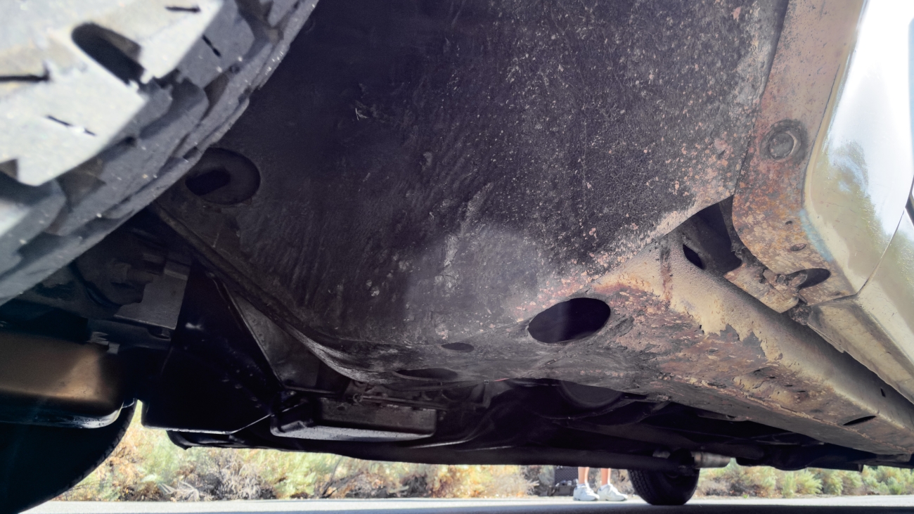 The undercarriage features power drum brakes, with the rear units replaced in 2020. A single exhaust system routes emissions to the right side of the tail.