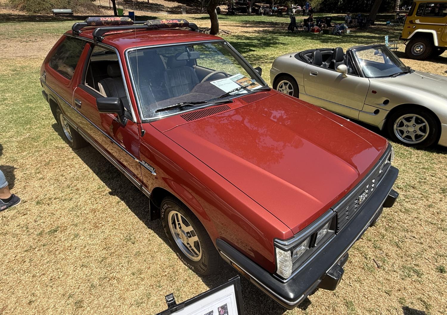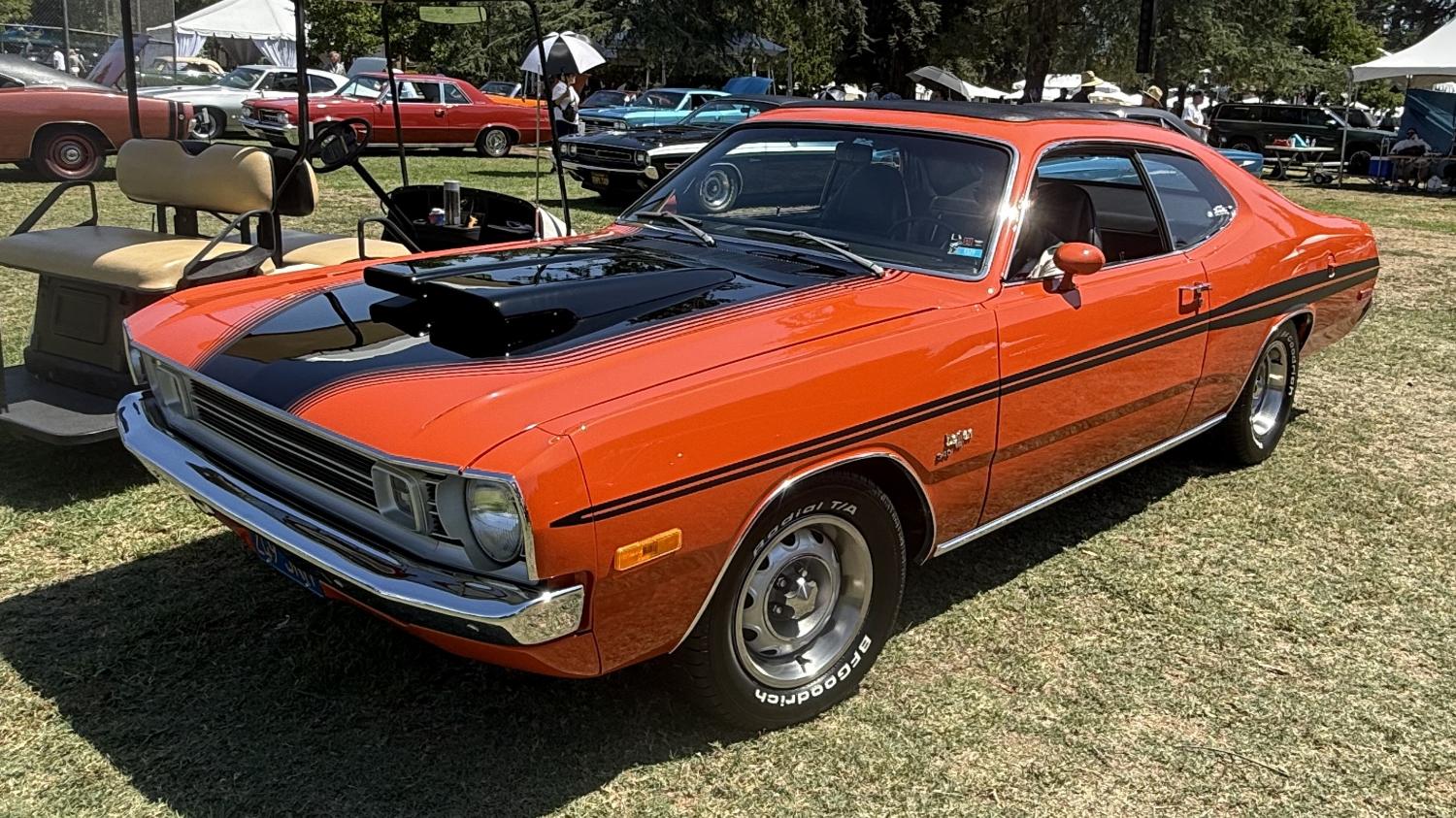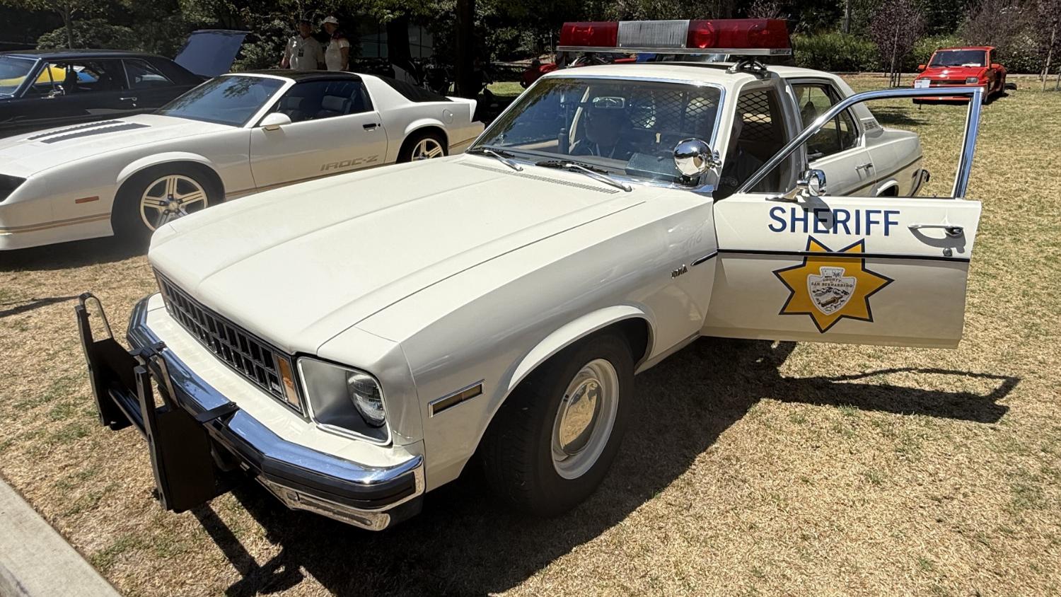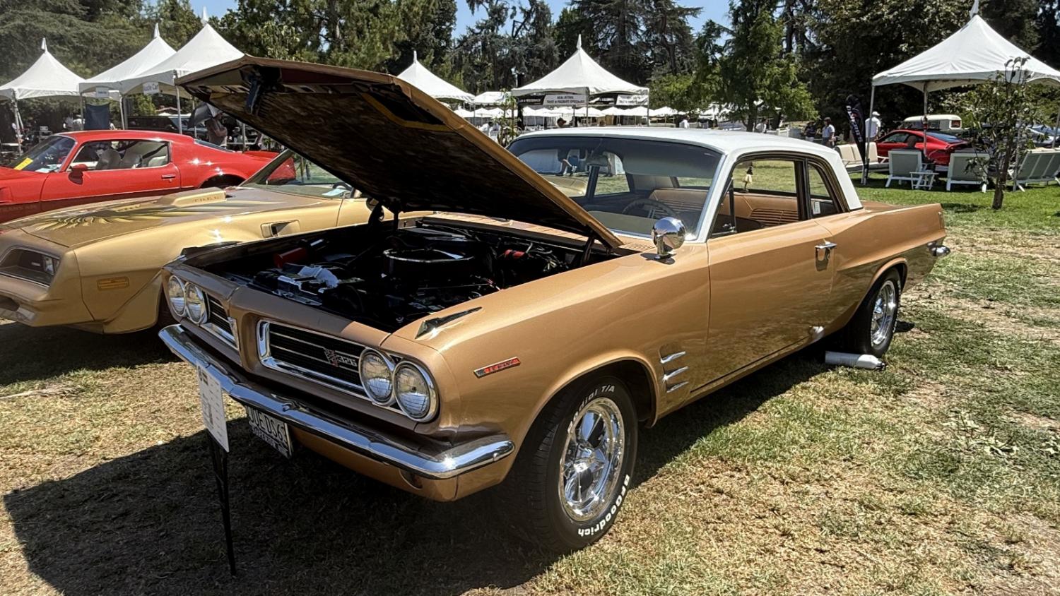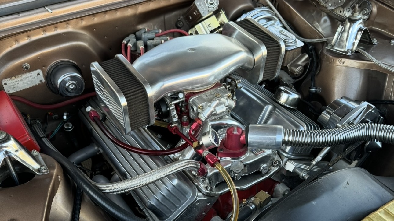 The word “understated” comes to mind when first looking at the car. After all, it’s a fairly nondescript tan-colored compact with 14-inch wheels, bench seats, and a no-frills overall theme. But pop the hood and you’re in for a surprise. The dressed-up, chromed engine compartment houses a 350ci small-block V8 that features a Holley four-barrel carburetor, Edelbrock intake manifold, aluminum heads, and aluminum radiator. The car’s B&M shifter is connected to a three-speed automatic transmission.