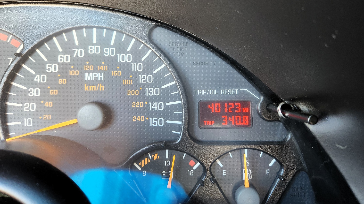 Instrumentation consists of a 155-mph speedometer, 7,000-rpm tachometer, and temperature, oil pressure, voltage, and fuel gauges. The digital odometer shows 40,123 miles, a figure slightly above the CARFAX report’s latest reading of 39,195 miles from July 2025.