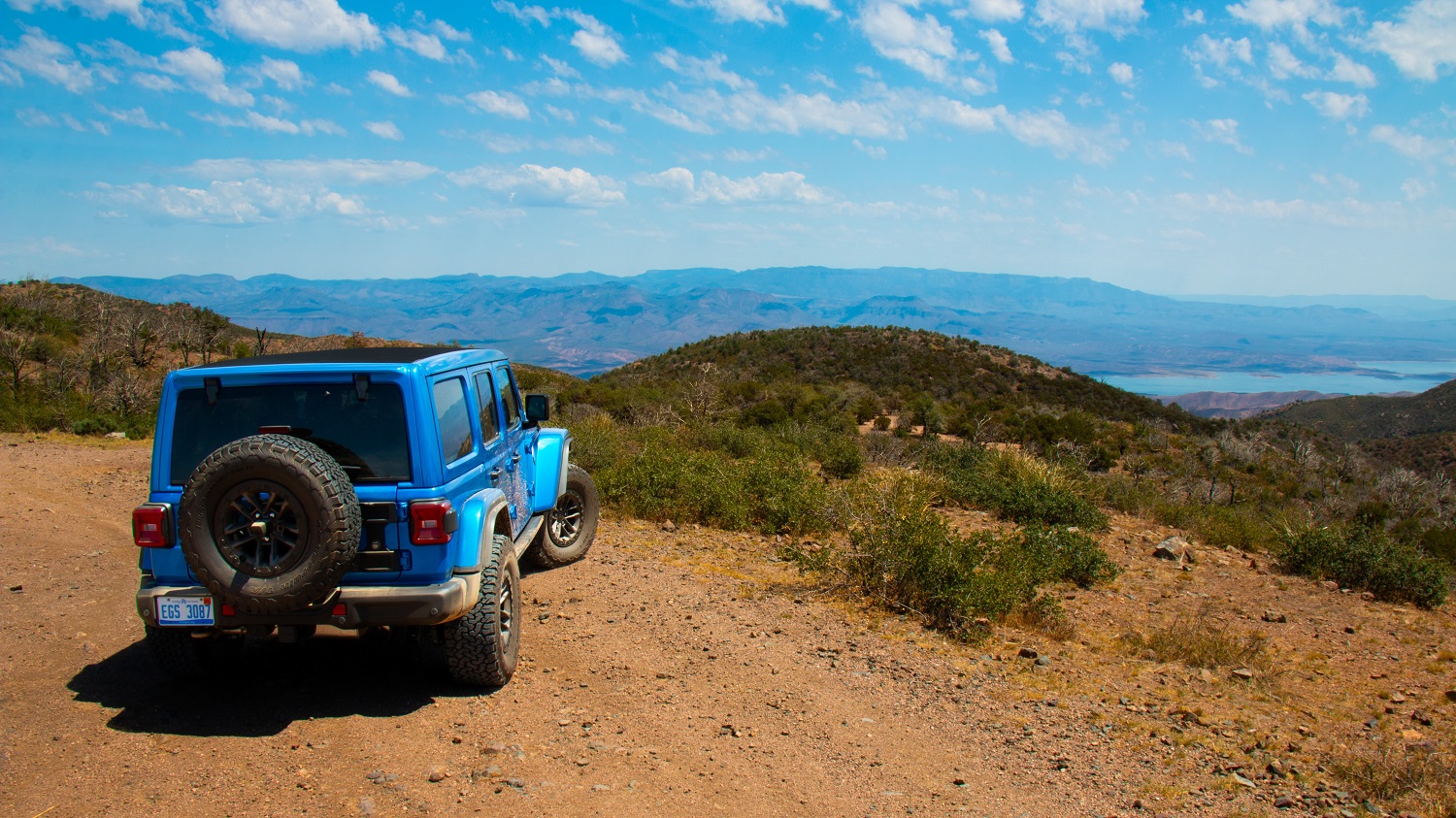 For better traction and throttle control, I muscled the transfer case lever into 4LO and started the ascent up the main trail. The higher we climbed, the more stunning the views were—and the further we kept going. The idea of going back down to find an obstacle that would ultimately fail to challenge the Rubicon 392’s grip and ground clearance became less and less appealing. All I wanted to do was go higher. Luckily, Brad and Chris felt the same way. At one point, we reached a pull-off area that gave us an unforgettable view of Roosevelt Lake. By the time we turned around to go back down, we were roughly 5,800 feet up.