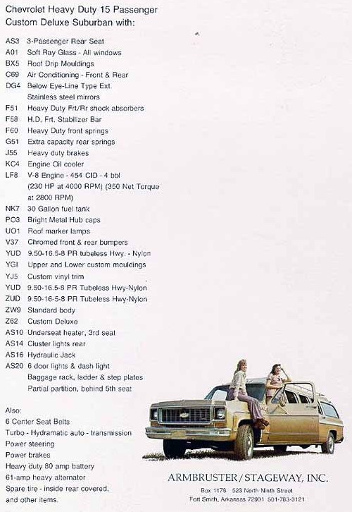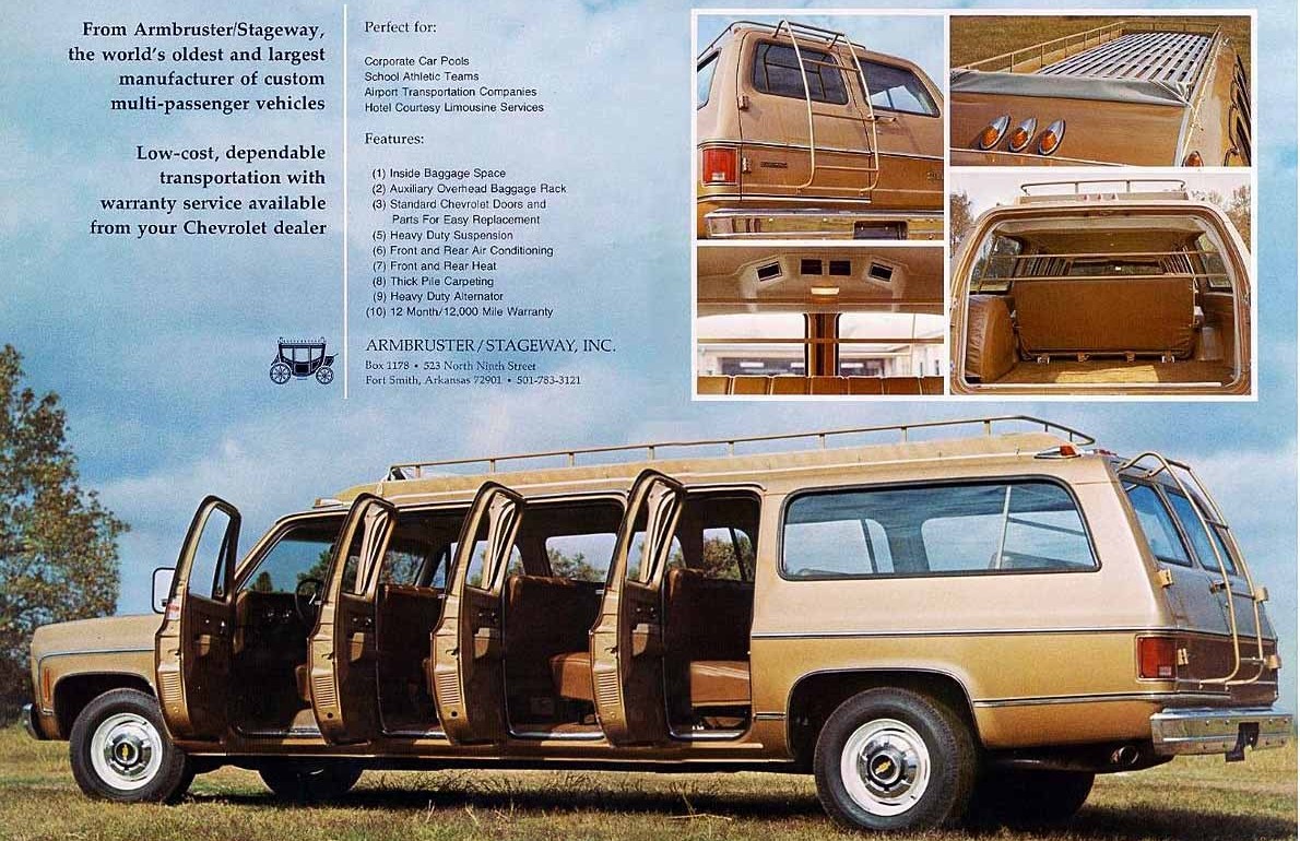 If you’ve ever been to a funeral, there’s a good chance you’ve seen an Armbruster Stageway hearse or ridden in one of its limousines. According to the Fort Smith, Arkansas, company’s website, it has “a rich tradition in the funeral car industry that dates back for over one hundred years.” But not all of its history is associated with sadness and loss. Back in the 1970s, Armbruster Stageway built a version of the Chevrolet Suburban with four pairs of doors that opened up to a 15-passenger cabin.