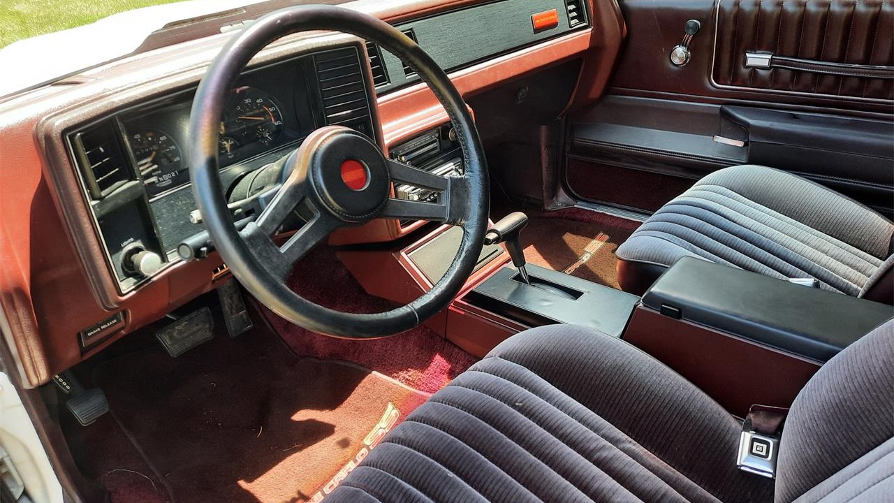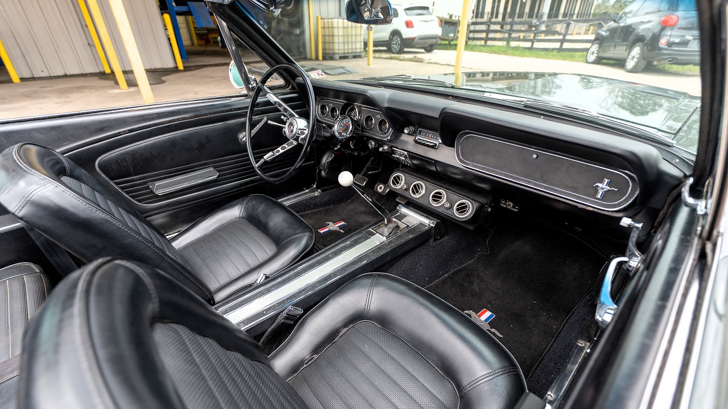 The four-way power-adjustable front bench seat was retrimmed in black upholstery with white pleated inserts and blue and red accents during the refurbishment. Matching upholstery extends to the door panels, and a black dashpad is fitted along with color-coordinated carpets. The dashboard retains a Ford push-button AM radio, a clock, a locking glovebox, engine-turned trim, and a Thunderbird badge. A C1 Corvette-sourced floor shifter was installed in the 1950s.
