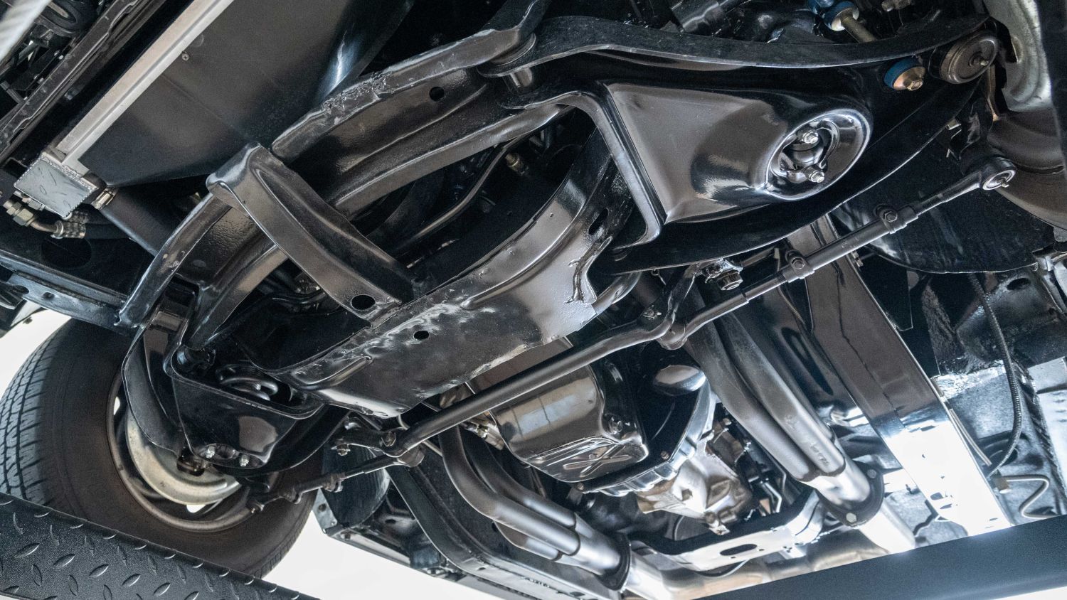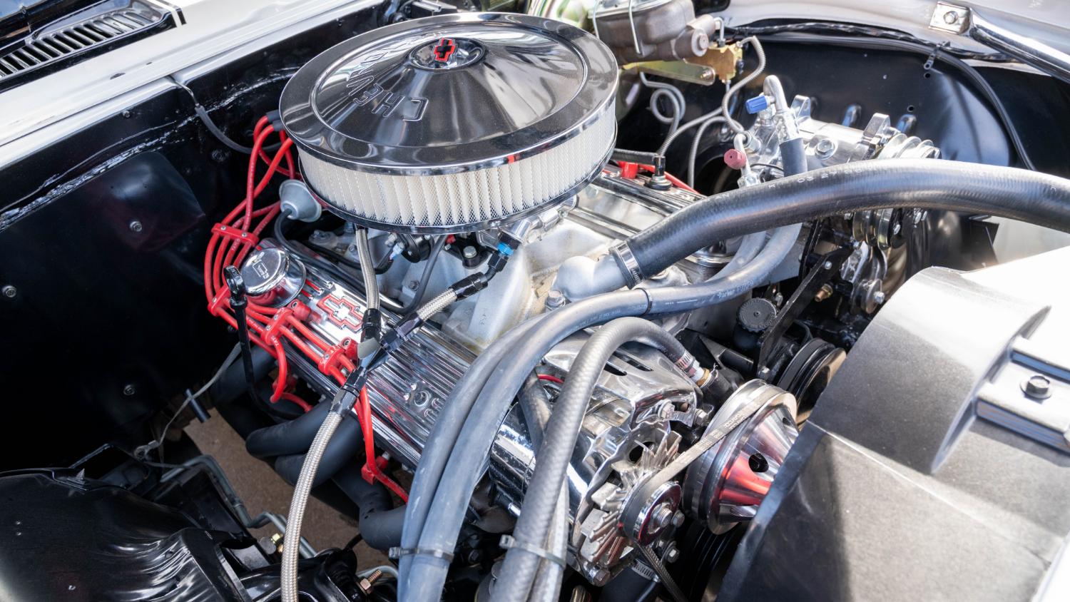 Powered by a 6.0-liter LS V-8 engine with SS3 cam, mated to a Tremec TKX five-speed transmission, with Art Morrison front subframe, Detroit Speed QuadraLink rear setup, coilovers all around, Wilwood disc brakes and 18-inch KWC wheels.