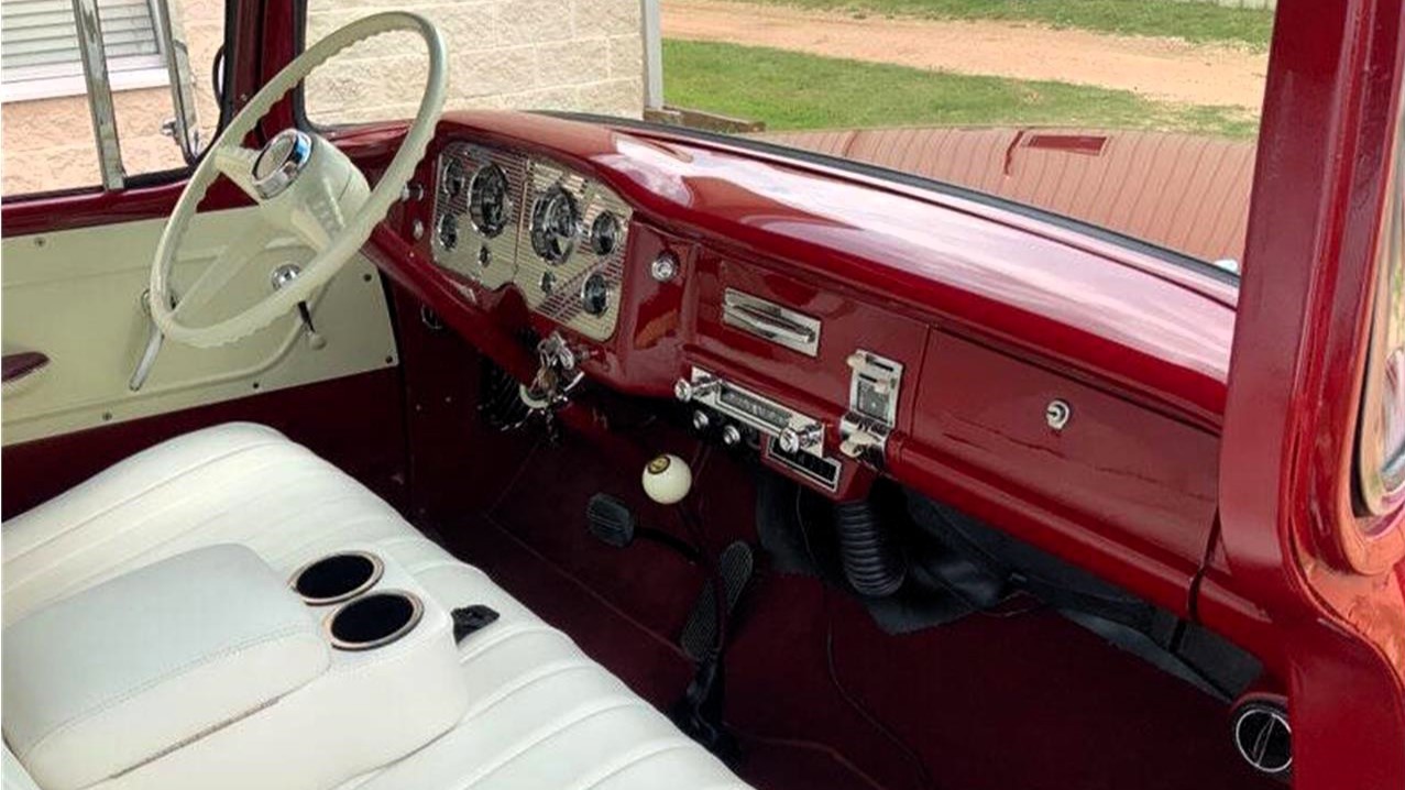 The exterior’s handsome color carries over into the cabin and contrasts nicely with the white leather bench seat, white door panels, and matching three-spoke steering wheel. Modern features include Vintage Air air conditioning and an AM/FM/Bluetooth audio system.