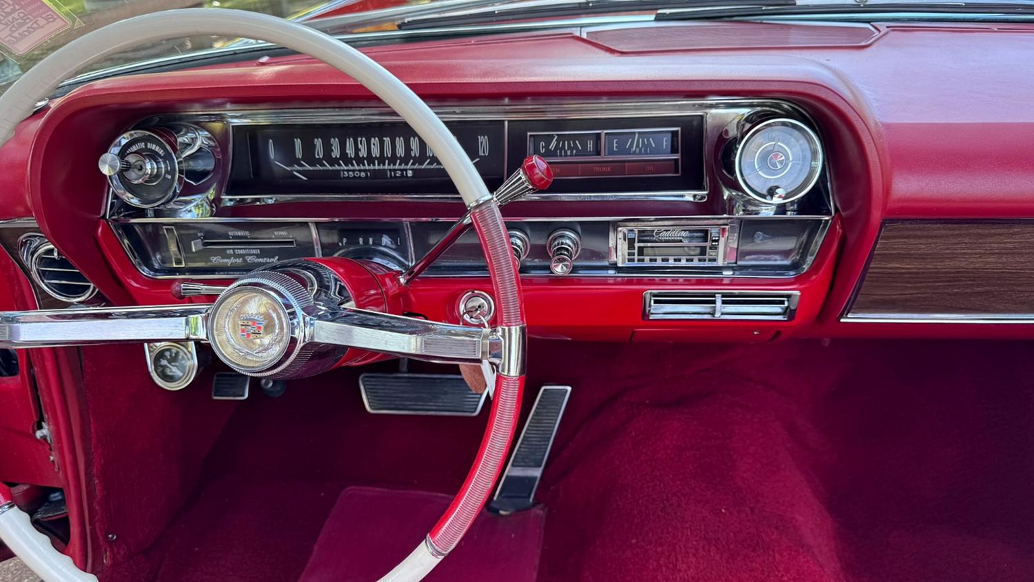The original color for this Cadillac was Firemist Saddle metallic with a Sandalwood top; now it is a bright red with a white top—power-operated, of course. Other features include a driver-side chrome remote mirror, lower-body chrome trim, a Fleetwood-spec rear grille, and a remote trunk lock. A set of 15-inch wheels with wire wheel covers is wrapped in 235/75 whitewall radials.