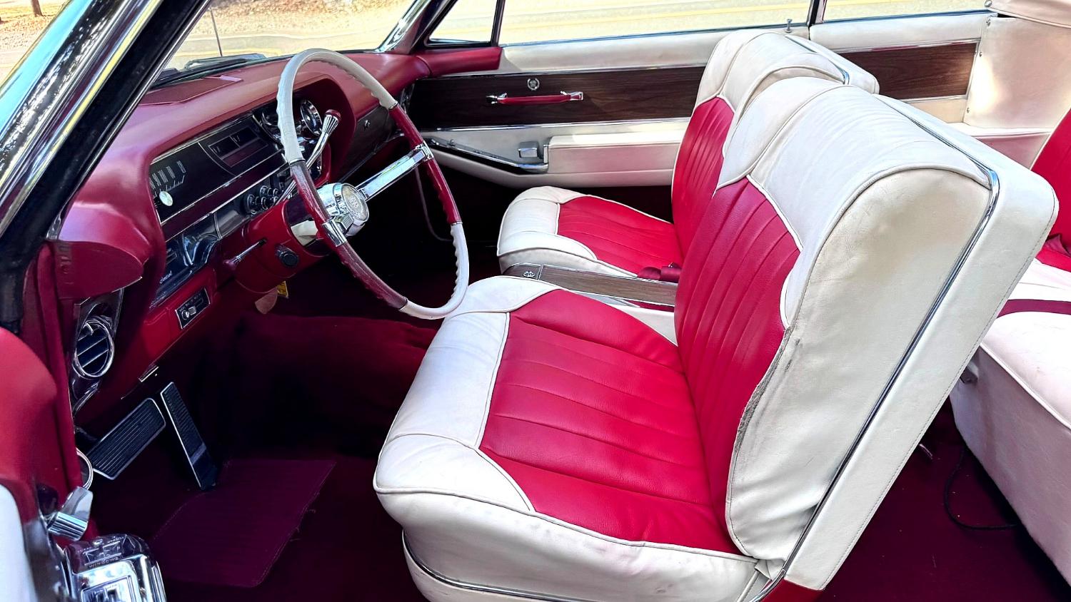 The original Sandalwood leather interior with front buckets has been replaced by white and red vinyl. Interior features include a red dashboard and carpet, a center console, woodgrain trim, a column-mounted automatic shifter, a tilt steering column, power windows/locks, an aftermarket retro-look AM/FM/Bluetooth stereo, and more. This Eldorado was originally equipped with air conditioning, but the compressor has been removed.