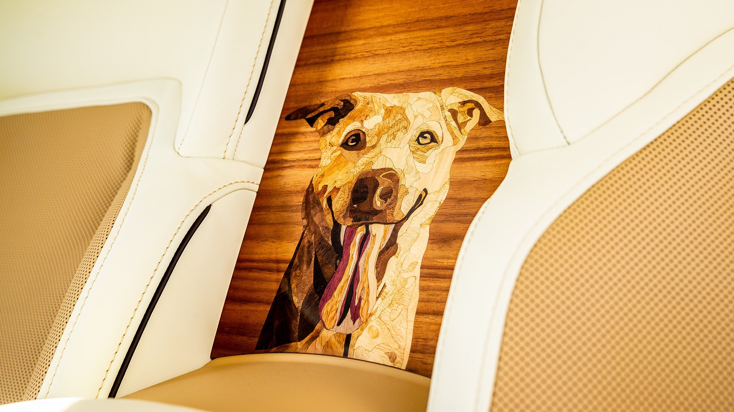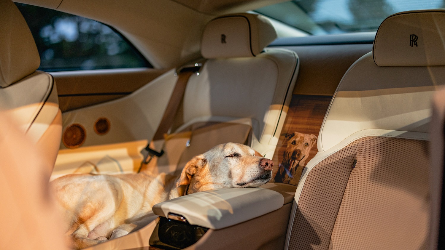 The most obvious nod to Bailey—aside from the reproductions of his paw print on the door sill treadplates and dashboard—is the intricate portrait of his face on the “waterfall” between the two rear seats. According to Rolls-Royce, it consists of more than 180 pieces of unstained veneer in 22 shades, and took more than four months to assemble. Bailey’s tongue and its color variations alone required four veneers: Purple Heart, Tulipwood, Louro Faia, and Pear, none of which Rolls-Royce has used previously.