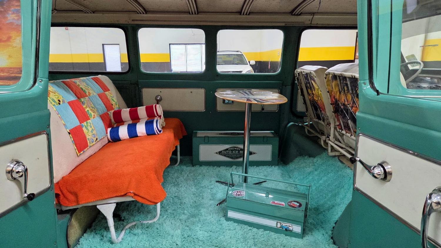 The large cabin features white vinyl 60/40 folding front seats, and vinyl and patterned cloth upholstery for the second row. Other features include teal shag carpeting, compass, custom surfboard table, dash-mounted hula girl, and manual steering.