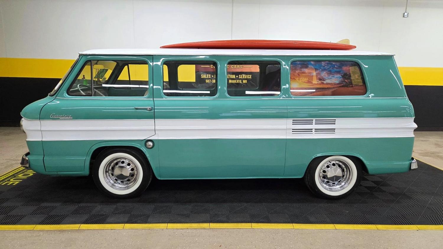 The turquoise and white paint scheme perfectly encapsulates 1963. Two front doors, right-side barn doors, and rear barn doors provide access to the interior. Other features include custom window tint, back-up lights, and engine vents on the rear fenders. A set of 14-inch Centerlines are wrapped in 215/70 Hercules MRX Plus IV radials.