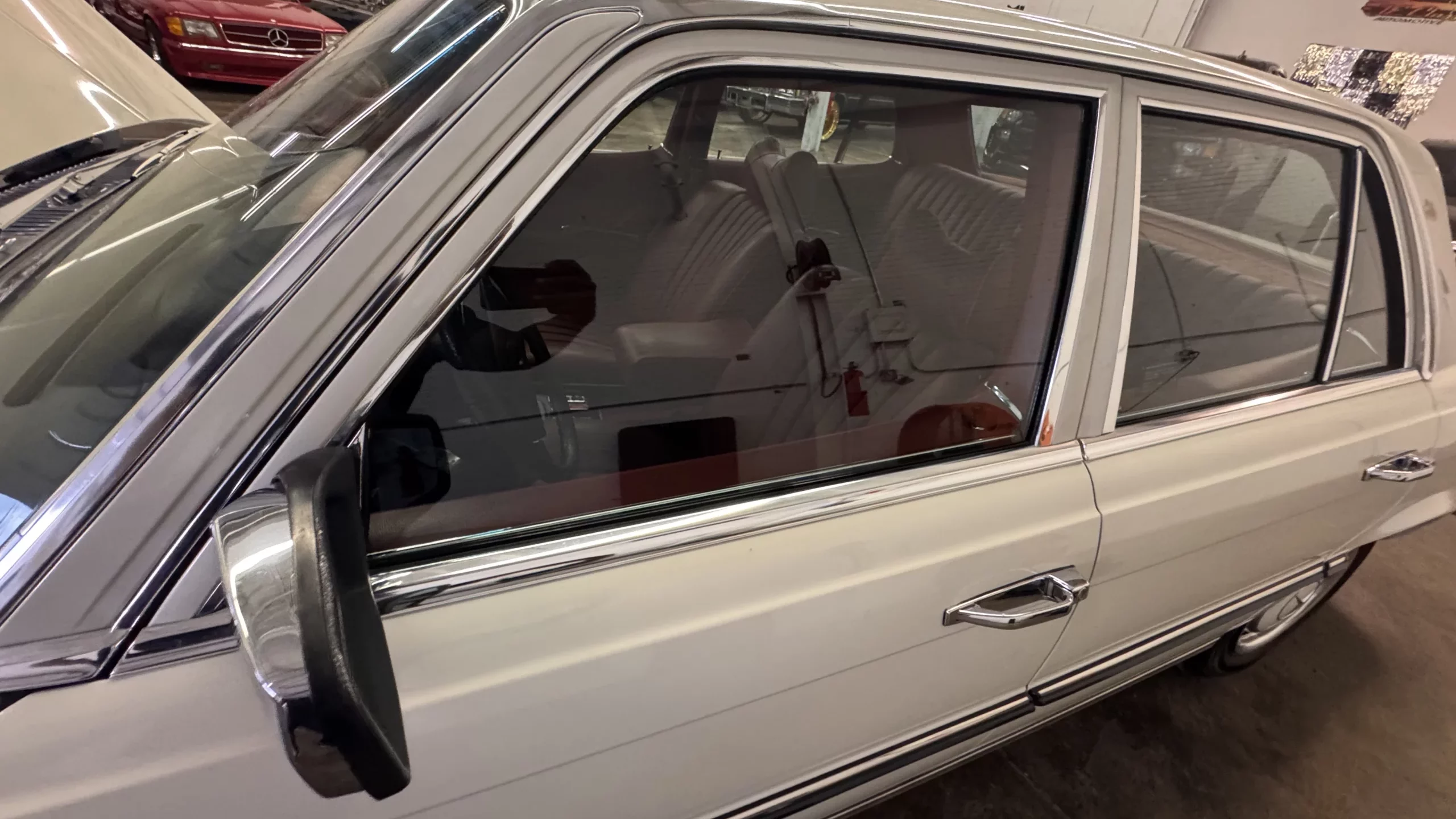 Finished in white over a red leather interior, this W116 is now offered by the selling dealer with service records and a clear title.