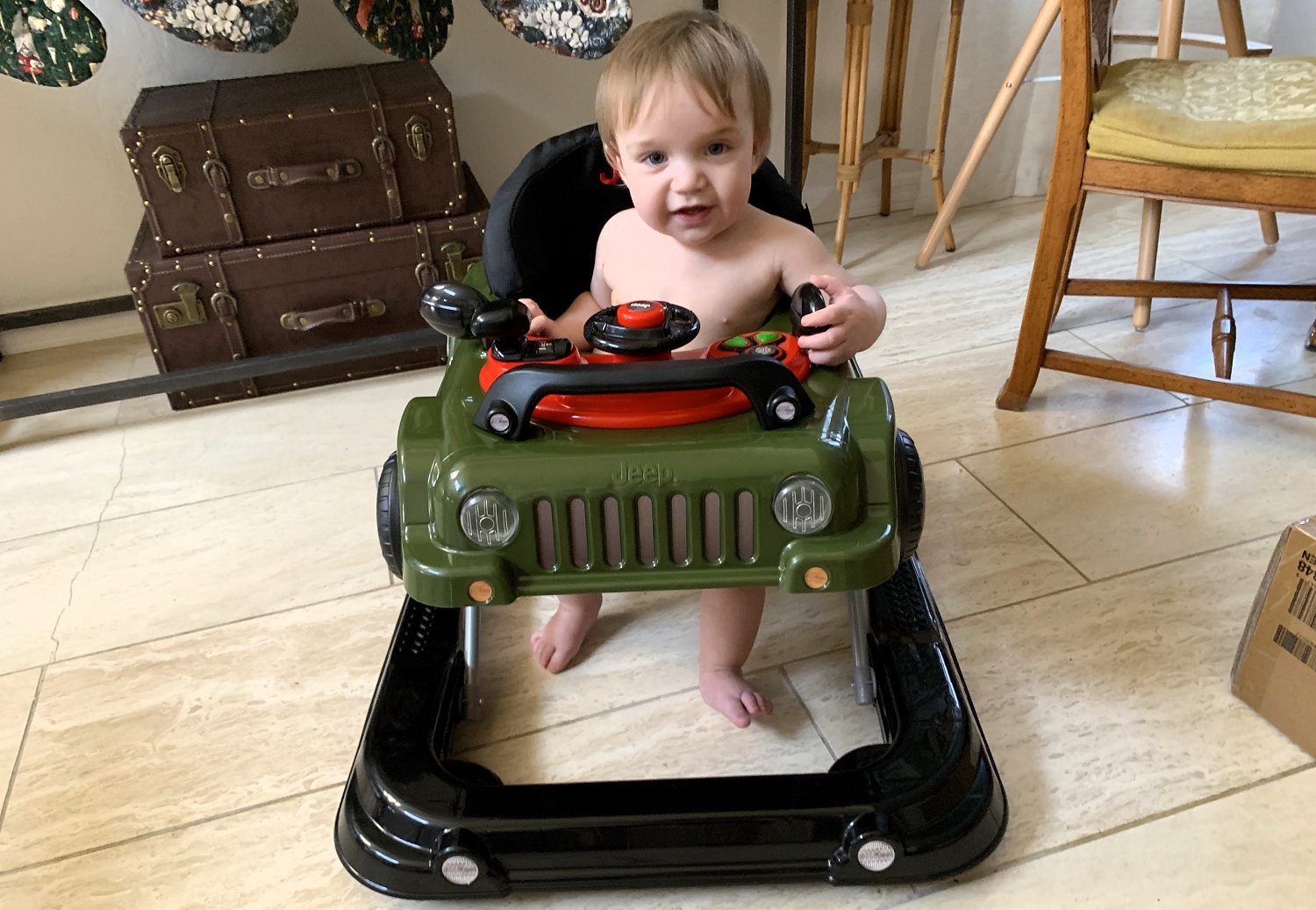 In a story from last year, I mentioned that Hayden is a good “driver.” Luckily, that hasn’t changed. He knows how to adjust his mirrors, plus he uses his turn signals. Hayden’s Wrangler doesn’t have a back-up camera, but there’s also no top so, when he needs to go in reverse, he just twists and looks behind him to make sure he’s clear. He even knows what bump stops are—his version of them, at least: when he bumps into a cabinet door or the dishwasher, he stops and moves on. “Mr. H” is years away from real off-roading, but he already knows to stay on the trail. If I stand in a doorway to keep him from going to a part of the house that’s off-limits, he doesn’t ram me or throw a fit—he backs up and returns to the designated trail.