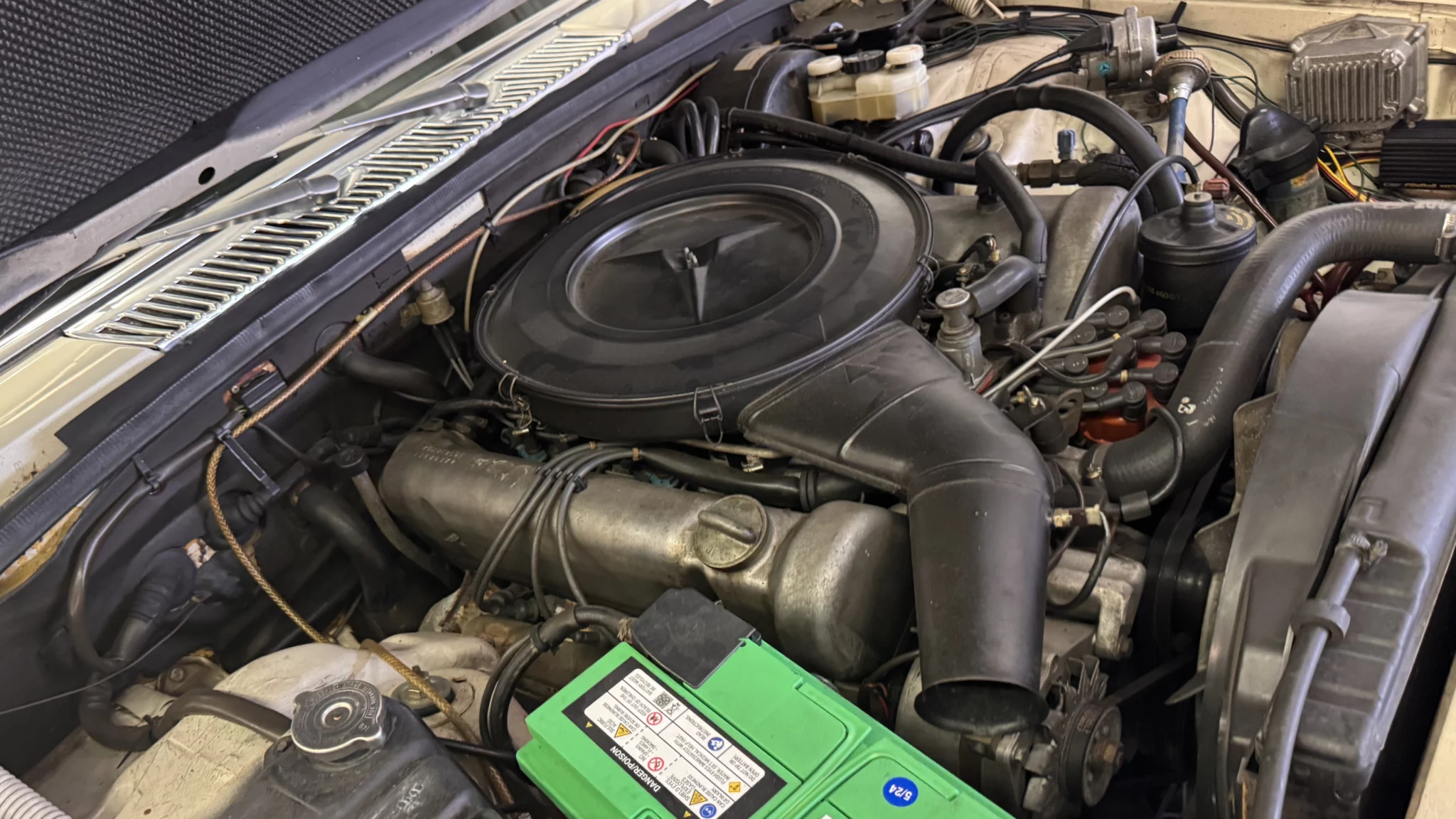 Under the hood is what you would expect from a nice example of a well-kept Mercedes S-Class. The engine bay has not been detailed to show-quality, but everything looks clean, correct, and tidy – even the hood pad, which I am guessing has been replaced at some point.