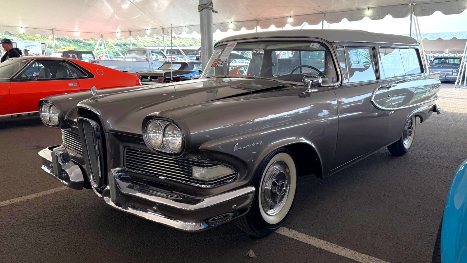 1958 Edsel Roundup Station Wagon The Edsel Bermuda seems to be an auction favorite, but when was the last time you’ve seen a two-door Edsel Ranger wagon? Only 963 were built. Based on the Ranger trim level, it was Edsel’s entry-level wagon, and the only two-door wagon within the brand. I’d say 303 horsepower is quite decent for a 361ci V8, plus it has that nifty drum speedo and the pushbuttons in the steering wheel hub. Other features include power steering, power brakes and Mark VI under-dash air-conditioning system. Neat!