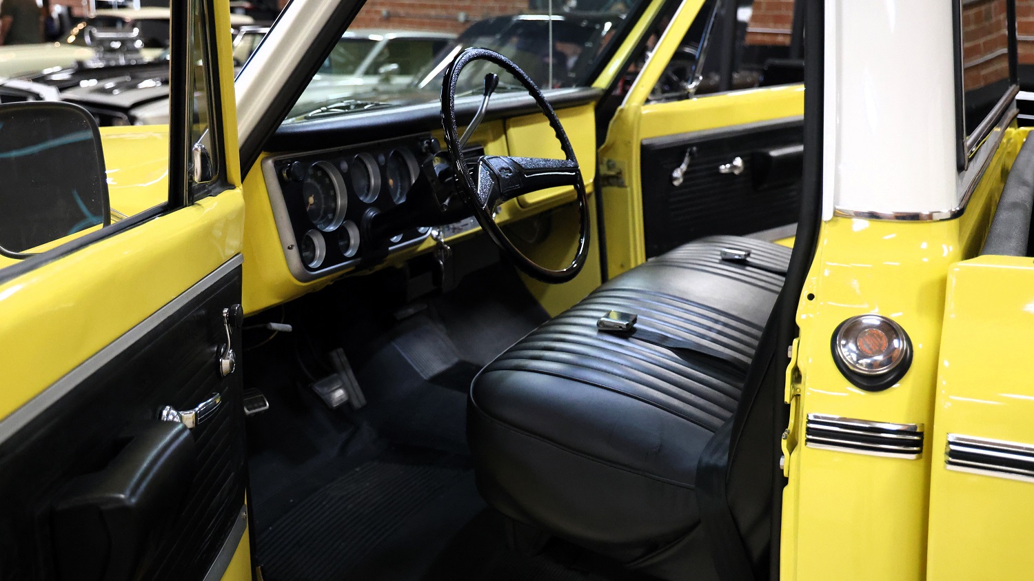 The cabin has its own two-tone color scheme of yellow on the dash and door panels, and black vinyl for the dash pad, bench seat, and door panels. Features include a column-mounted shifter and power brakes with discs in the front and drums at the rear.
