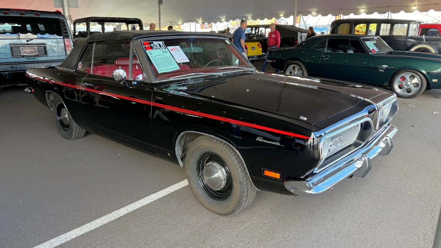 1969 Plymouth Barracuda Convertible Immediately,it’s apparent that whoever spec’d out this wild fish had good taste because the black and red combination is stunning. Though equipped with the decidedly non-performance 318, this Barracuda droptop is also equipped with the goods: four-speed manual with console, “V7R” stripes, Rally instrument cluster, front disc brakes, and more. Only 1,442 Barracuda convertibles were built, of which 56 were U.S.-spec 318 four-speeds, so it’s decidedly rarer than an equivalent Mustang.