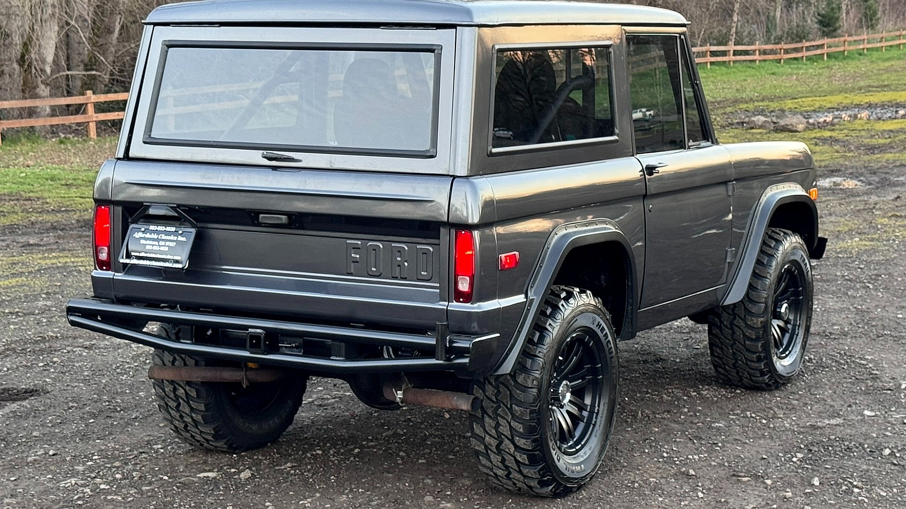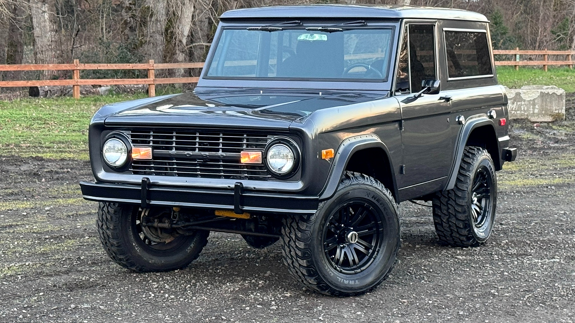 While originally finished in Mallard Green (color code V), this 1971-model Bronco has been resprayed in Dark Gray Graphite. Exterior features include black-finished bumpers, fender flares, a driver’s-side mirror, and a dual exhaust system. The 17-inch aftermarket wheels are shod in grippy 33-inch Hercules Trail Digger M/T tires.