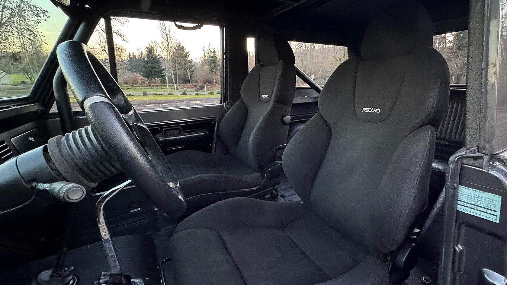 The cabin in this Bronco has been modernized with a set of Recaro black cloth bucket seats, a MOMO steering wheel, a Kenwood audio system, and custom speakers. In keeping with the Bronco’s all-terrain, all-weather approach, the flooring is a textured, painted metal finish instead of carpeting, which makes for easy clean-up after the going gets rough.