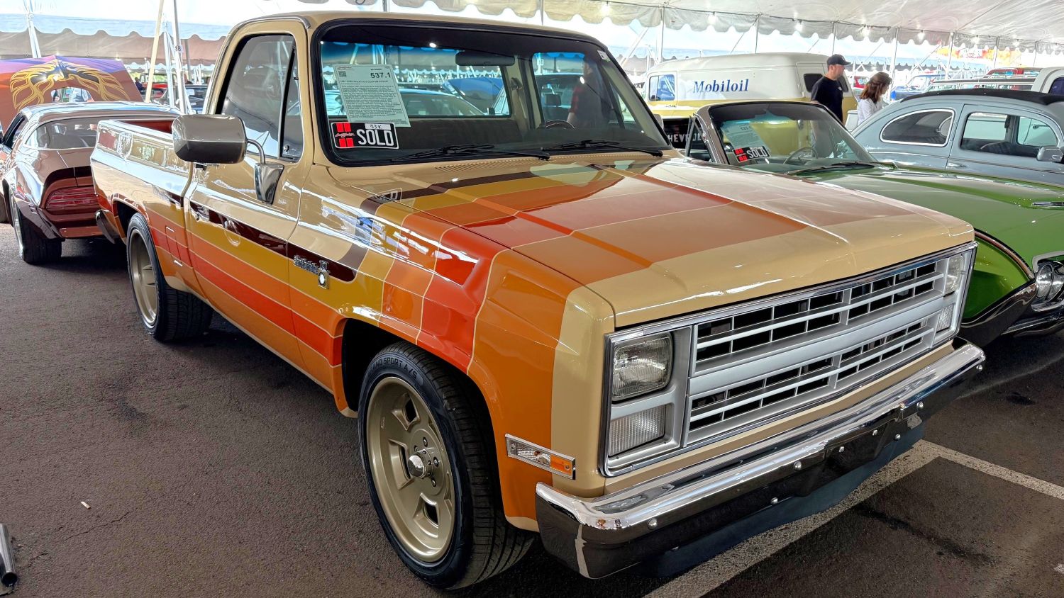 1987 Chevrolet R10 Custom Pickup You could say that lowering a pickup, adding staggered 20×8 (front) and 20×10 (rear) wheels, upholstering a custom leather interior, and refreshing the windshield, bumpers, lights, brakes, belt, driveshaft and window felts can reinvigorate an old pickup. But none of that catches the eye like the Desert Fox-inspired paint treatment with custom-laid stripes and color-matched bed liner.