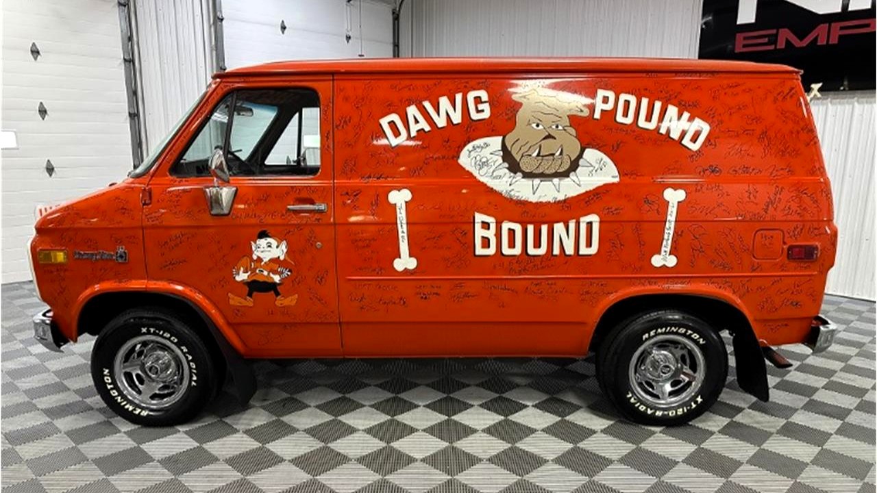 The custom van spirit is demonstrated by this 1982 Chevrolet G10 van. As the lightest-duty van in the Chevrolet roster, it was available in 110- or 125-inch wheelbase. This one appears to be the former, a Chevy Van for the working man (and woman) versus the consumer-friendly Sport Van suited for families and comfort. In addition, this van features the standard powertrain configuration: a 120-horsepower 4.1-liter V-6 backed by a three-speed on the column. Yet the attraction to this vehicle is a bit more profound because this van has been transformed into the spirit of the 1970s — it’s now the Dawg Pound-bound van dedicated to the Cleveland Browns football team. In case you’re not in-the-know, the Dawg Pound is a fan section of Huntington Bank Field where loyalists wear dog masks and bark in support of the team. In addition, the van has been signed by “hundreds” of Cleveland Brown Hall of Famers and team legends (including Jim Brown, natch!).