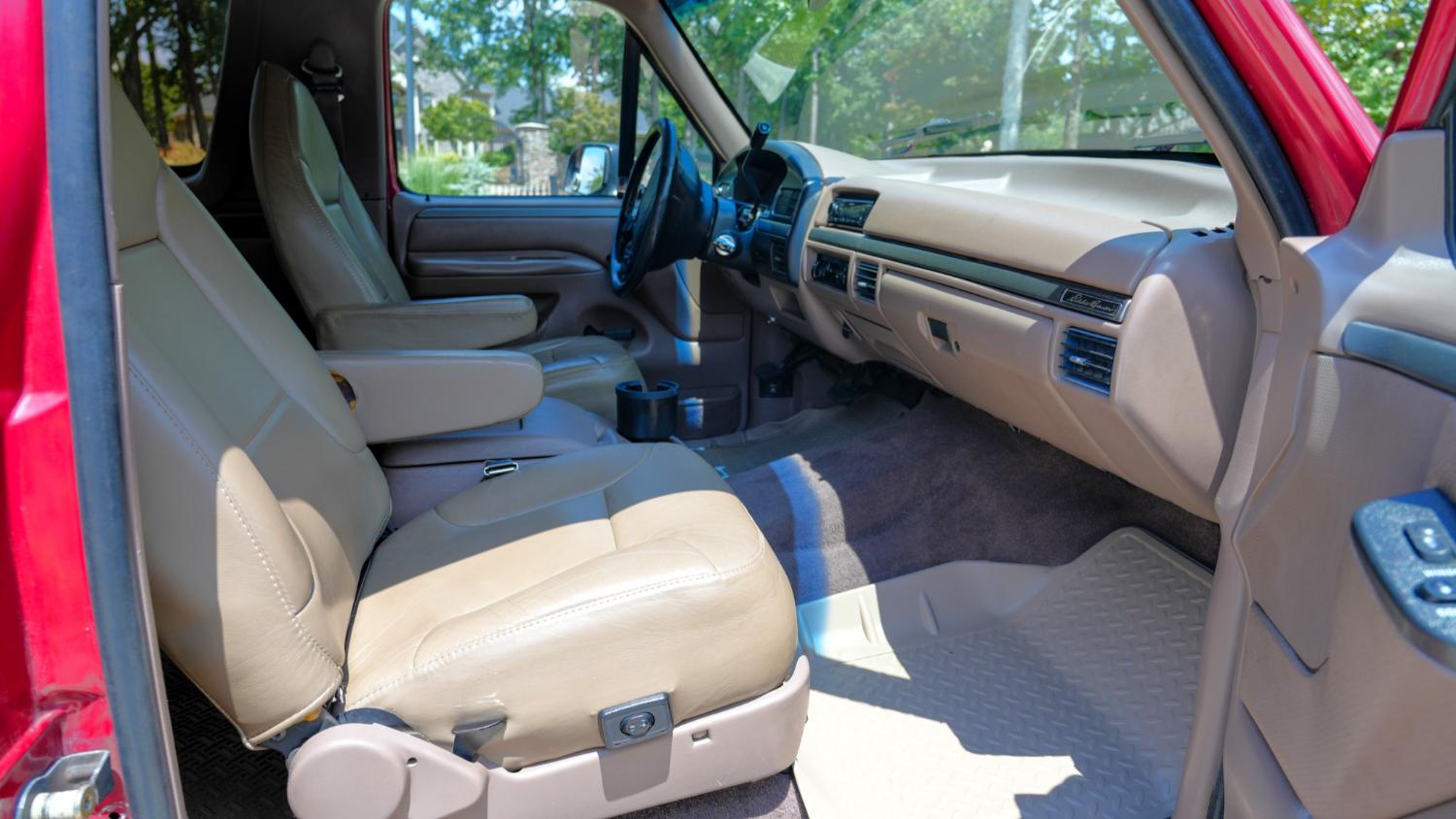 As this Bronco has the Eddie Bauer trim level, the cabin is furnished in Medium Mocha leather upholstery with a pair of power bucket seats up front. A matching center console with storage is situated between the two buckets. Other features include air conditioning, cruise control, power steering with tilt column, power windows and door locks, and aftermarket Kenwood AM/FM/auxiliary stereo with Bluetooth and Sirius/XM capabilities.