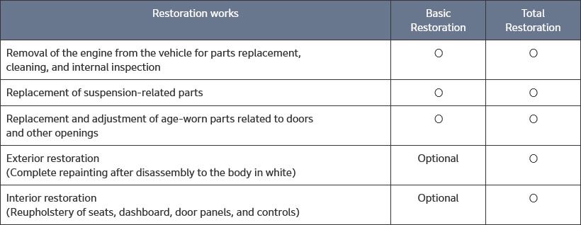 A Basic Restoration will cover replacing worn-out engine, suspension, and door- and other opening-related parts; a Total Restoration will include those areas as well as a complete disassembly and repaint in addition to an interior overhaul.