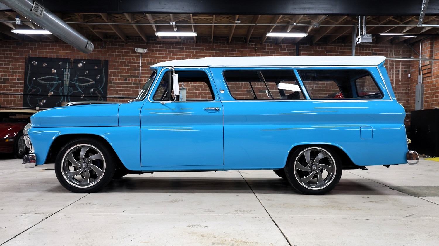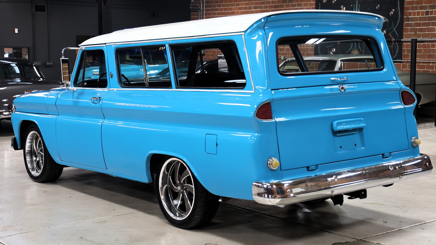 Right now on AutoHunter, you can find this 1966 GMC Series 1000 Custom Suburban, which received more than $45,000 in updates and modifications during a frame-off restoration. It’s equipped with a 350ci V8 paired with a 700R4 four-speed automatic transmission. Finished in turquoise and pearl white over a black and light turquoise vinyl interior, this classic American SUV comes from the selling dealer in Missouri with receipts, a spare wheel and tire, and a clear title.