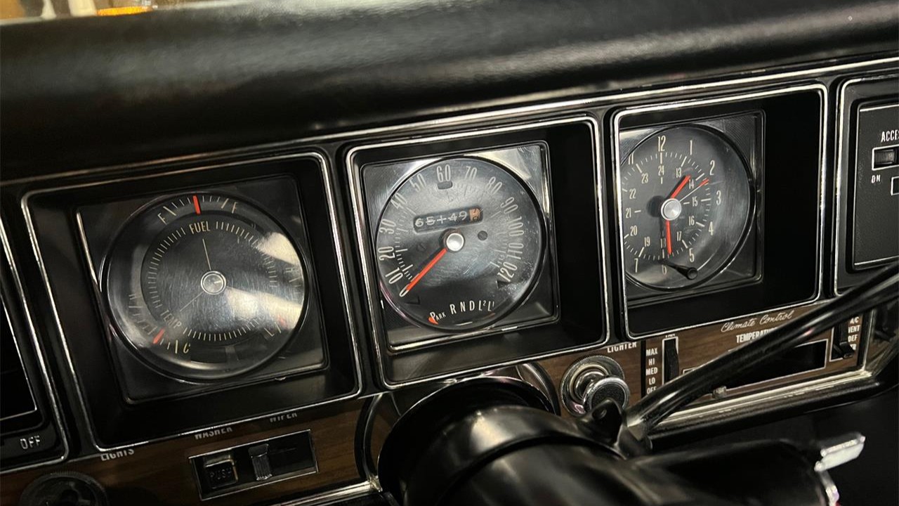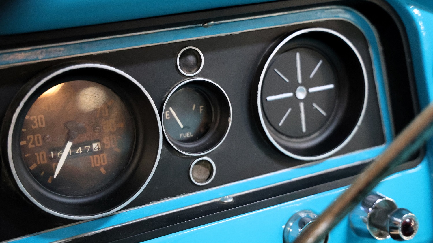 Instrumentation consists of a 100-mph speedometer and gauges for the oil pressure, water temperature, and fuel level. A pair of aftermarket gauges display the fuel level and temperature. The odometer indicates 16,147 miles, but this vehicle’s title shows that it’s mileage-exempt.