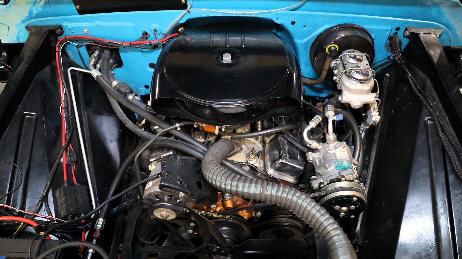 Under the hood is a 350ci V8 equipped with an Edelbrock intake manifold, an Edelbrock four-barrel carburetor, and long-tube headers. In 2019, a new MSD ignition was installed along with new spark plugs and wires, distributor, electronic fuel pump, and throttle linkage. The following year, a 700R4 four-speed automatic with a transmission cooler was added to the build.