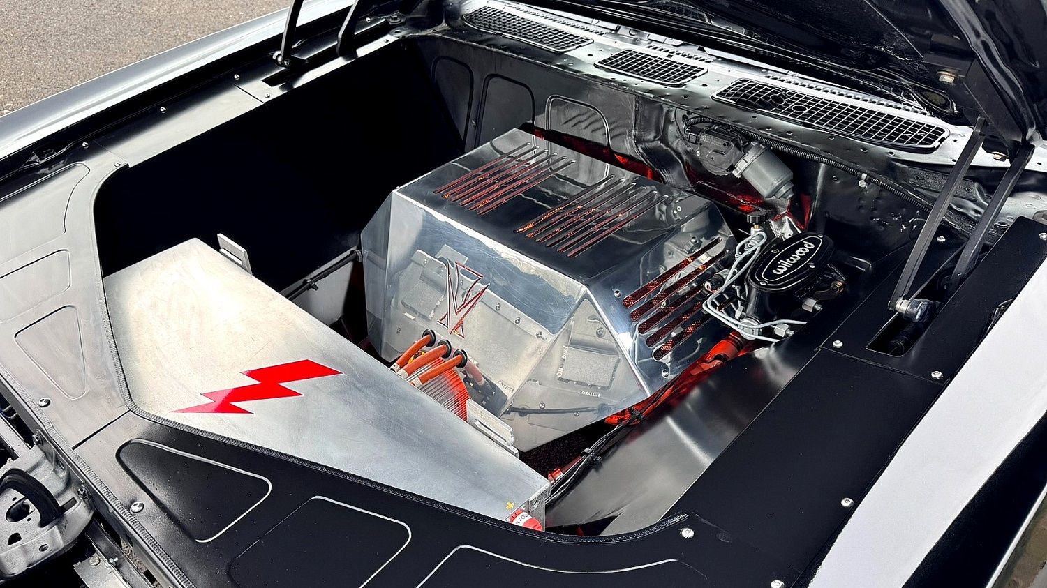 According to the EV Builder’s Guide, a pair of NetGain HyPer9 electric motors with 253 horsepower 649 lb-ft of torque power this pickup/passenger car. The 66.6-kWh battery pack is divided between the engine bay and the cargo bed. A single-speed automatic and an aluminum driveshaft sends that zip (and zap) to a 1992 Ford Thunderbird rear end. Also on this build’s long list of updates is a Ford Mustang II front end, QA1 coilovers, and Wilwood power four-wheel disc brakes.