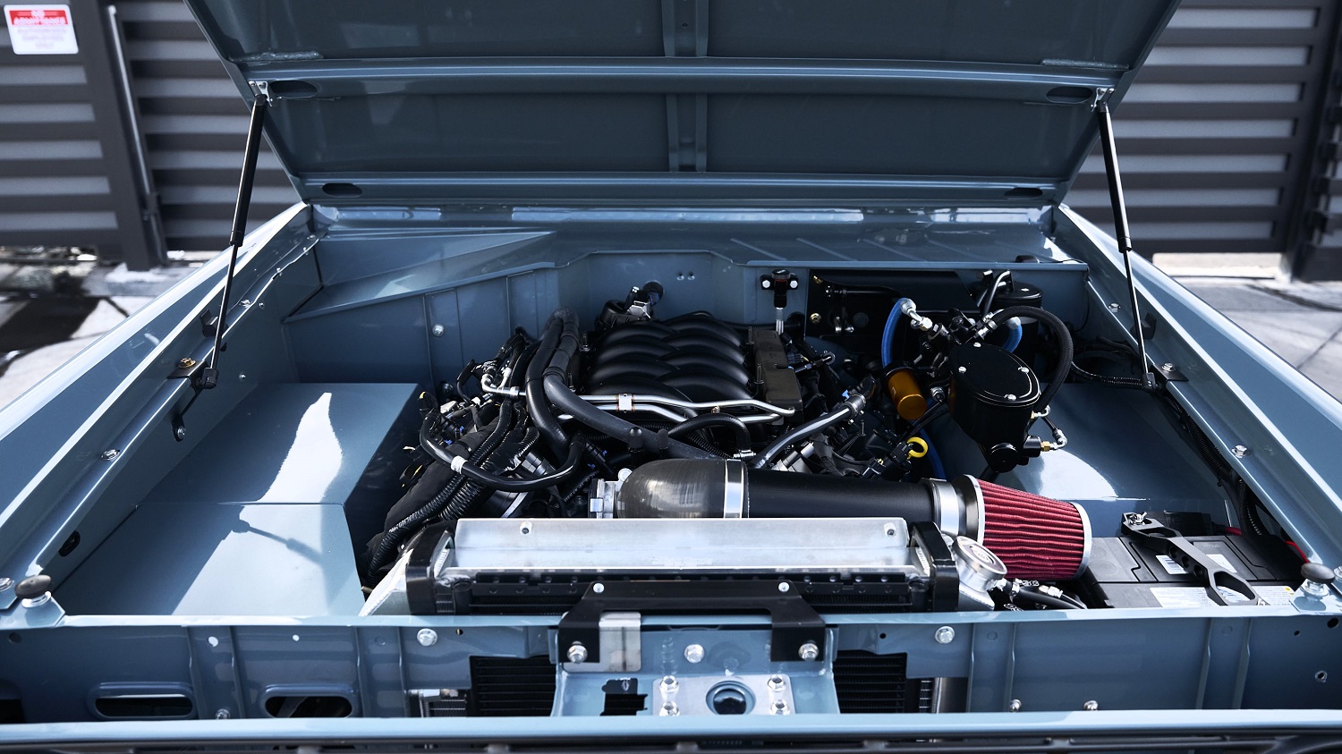 Under the hood, the original 302 was replaced with a third-generation Ford Coyote 5.0-liter V-8. The original transmission was replaced with a 6R80 six-speed automatic. Power reaches the rear or all four wheels through a dual-range transfer case with a twin-stick setup, which offers independent control of both axles and a low-range setting for just the rear end.