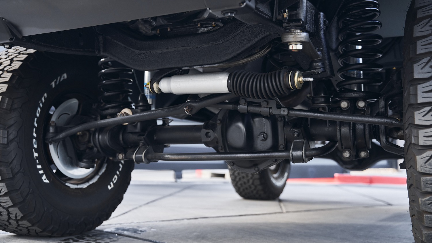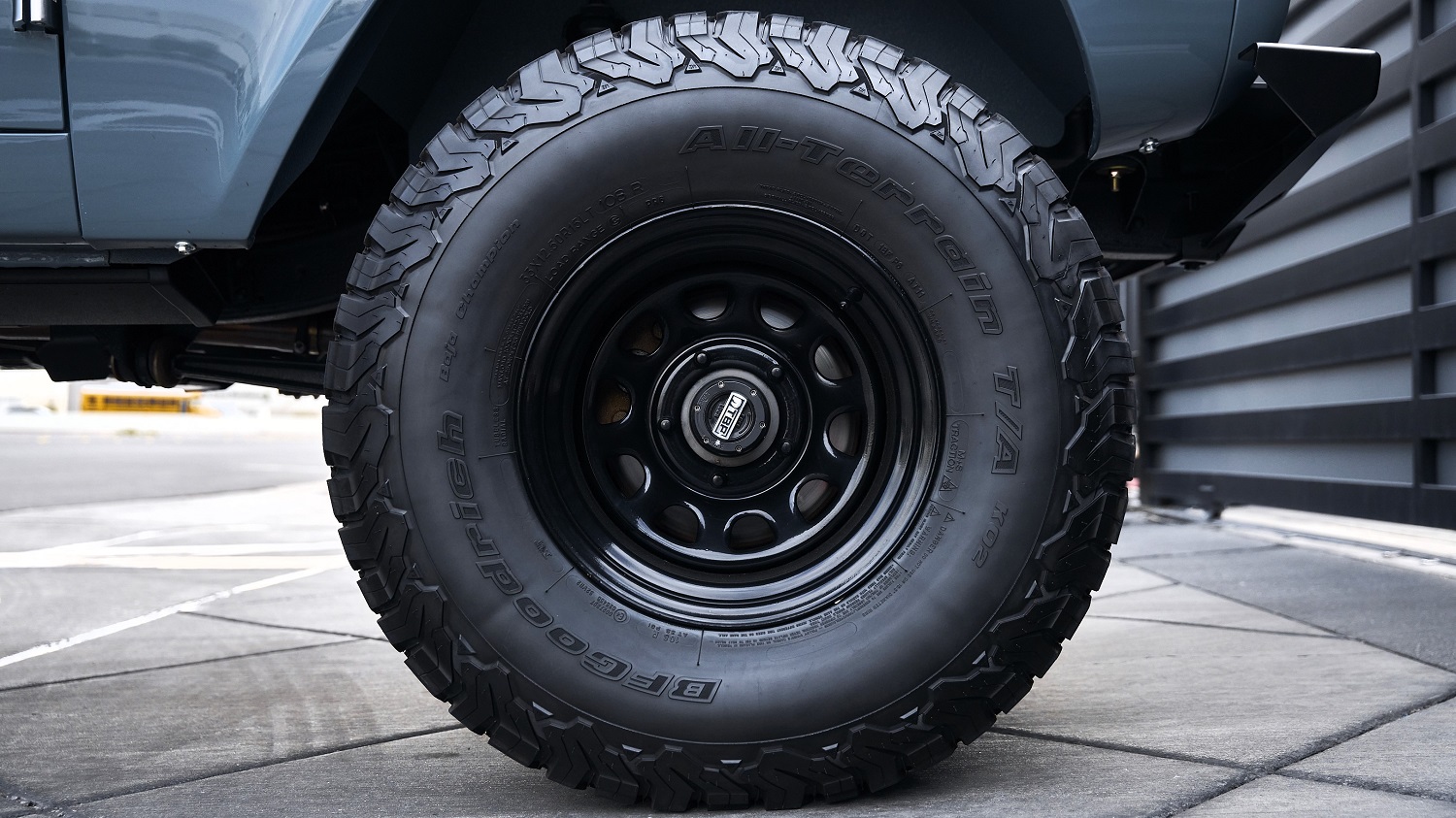 As part of the extensive series of modifications, the wheels and tires were upgraded to 15-inch black steel wheels with 33-inch BFGoodrich All-Terrain T/A KO2 tires.