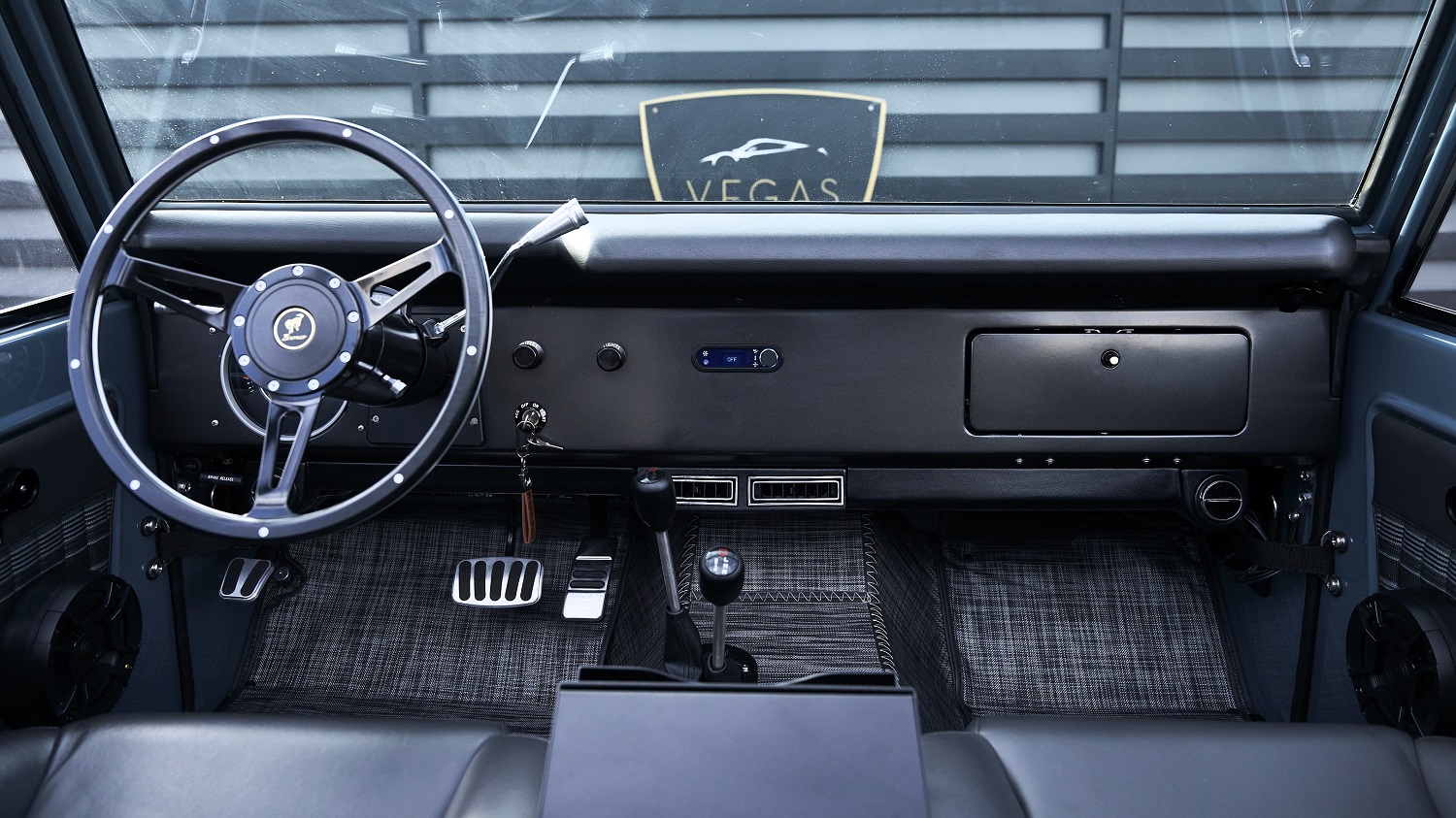 The cabin continues the blacked-out theme with aftermarket black vinyl bucket seats, which are divided by a center console with an armrest, two cup holders, wireless charging pad, and drive mode selector dial. Other features include electric power steering, Budnik three-spoke steering wheel, air conditioning, and RetroSound AM/FM radio with Bluetooth connectivity.