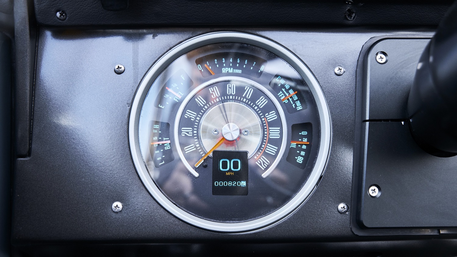 A Dakota Digital combination gauge houses a 120-mph speedometer, 8,000-rpm tachometer, and battery, fuel, temperature, and oil pressure gauges. The digital odometer shows 820 miles, but this rig is mileage-exempt, according to its title.