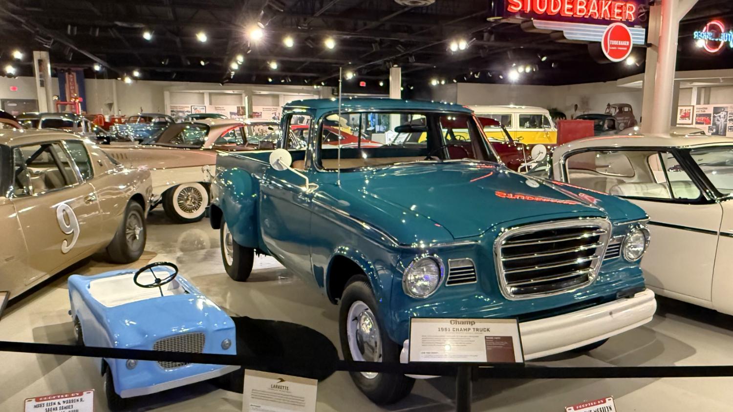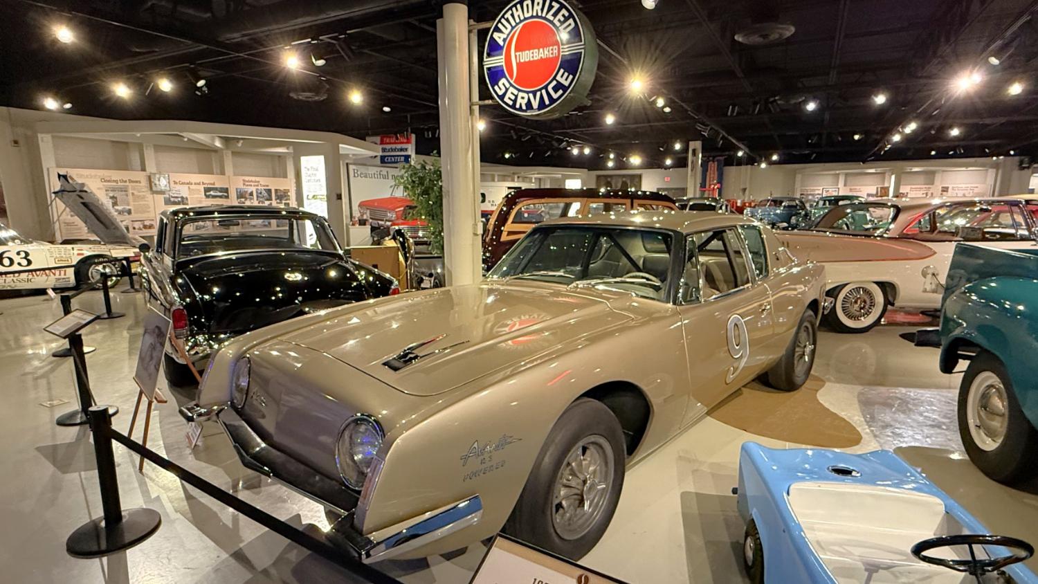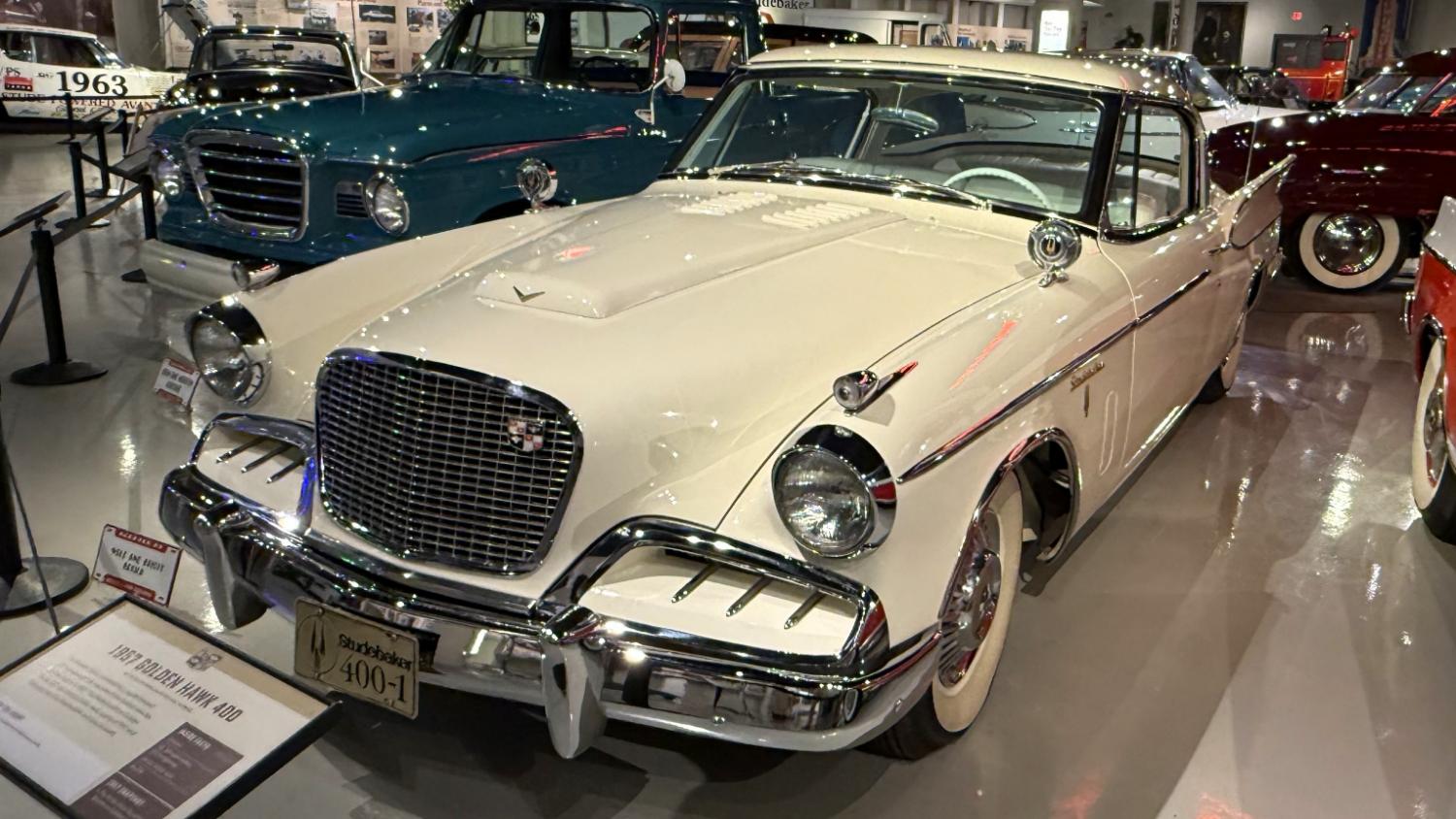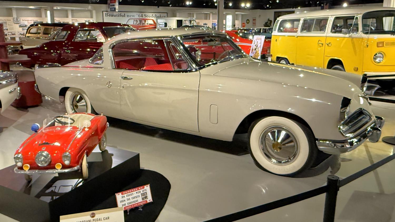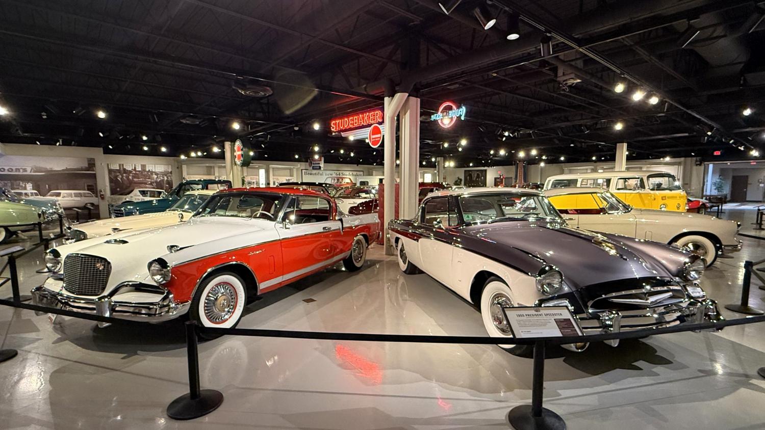 c.1835 Conestoga wagon1863 hearseOliver, a company from South Bend, built this plow in 1893.1950 Champion convertible1910 dump wagon1919 “Izzer” buggy, the last Studebaker buggy built.This Barouche carriage took President Lincoln to Ford’s Theatre. You know what happened next.Studebaker built EVs before ICE cars. This coupe is from 1911.The 1910 E.M.F. was sold by Studebaker dealers, then absorbed by the company.This 1904 Model C is the oldest surviving gas-powered Stude.1912 Flanders 20 was Studebaker’s entry-level model.1913 Model 25 Touring featured a rear-mounted transaxle.1913 E6 Touring was the first six-cylinder Studebaker, helping the branch achieve fourth place in the industry.1922 Big Six child’s hearse1928 Commander roadster traveled 25,000 miles in under 23,000 minutes (just under 16 days). 1920 Light Six, the first Studebaker auto build in South Bend.This 1919 Big Six traveled 90,000 miles in two years, 390,000 in five.1927 Erskine, Studebaker’s attempt at a lower-cost vehicle.1929 President State 7-passenger sedan with 135-inch wheelbase.The Rockne succeeded the Erskine but was only built from 1932-33. This is a 1932 Rockne 65.1932 President St. Regis Brougham1932 President convertible coupe1938 State Commander convertible sedan1933 Speedway President1916 SF-Four roadster1925 Big Six Duplex phaetonThese letters were used by the Newman Altman Studebaker dealership in South Bend.Upstairs, we find several movie cars mixed in with more of Studebaker’s history.Any James Bond fans recognize this 1974 AMC Hornet?1966 Ford Thunderbird from “Thelma & Louise”This 1935 Commander was used in “The Color Purple.”1947 M5 half-ton pickup1949 2R5 pickup1937 Coupe Express was produced through 1939.1940 President Club Sedan1962 Sceptre prototype designed by Brooks Stevens was to replace the Hawk.1941 Champion1928 fire truck from St. Joseph, MichiganThis 1966 Cruiser is the final Studebaker built, marking an end to 114 years of vehicle manufacturing.1963 ZIP van1947 Champion Deluxe station wagonThis 1964 Daytona was the last vehicle to be built in South Bend; production resumed in Hamilton, Ontario, Canada. It is powered by an R1 289.1950 Commander Starlight coupe1953 Champion Starliner 1956 Packard Predictor show car1956 Golden Hawk and 1955 President Speedster1957 Golden Hawk 400, a rare version with an all-leather interior.Studebaker Special raced in the 1933 Indy 500.1961 Champ truck1963 Avanti “#9” hit 170.81 mph at Bonneville.1958 President Starlight1958 Scotsman1949 Champion Regal sedan1952 Commander Starliner1964 GT Hawk with supercharged R2 engine originally owned by Brooks Stevens.This 1963 Avanti hit 200 mph at Bonneville in 1993.Studebaker’s first V-8 appeared in 1951.The 1964 R4 measured 304.5ci and featured dual quads and 12.0:1 compression.The basement vault featured more eclecticism from different Studebaker eras.1956 President Classic special-ordered in Ceramic Green, a Hawk color.1964 Pursuit Marshall was one of 30 sent to the Seattle Police Department for evaluation.1959 Lark features an experimental rear-engine layout powered by a 1953 Porsche.“Blackout” 1942 Champion c.1942 T42 Weasel1908 “Extension” station wagon and 1936 Ace truckThe 1950 Land Cruiser rode on a 124-inch wheelbase.